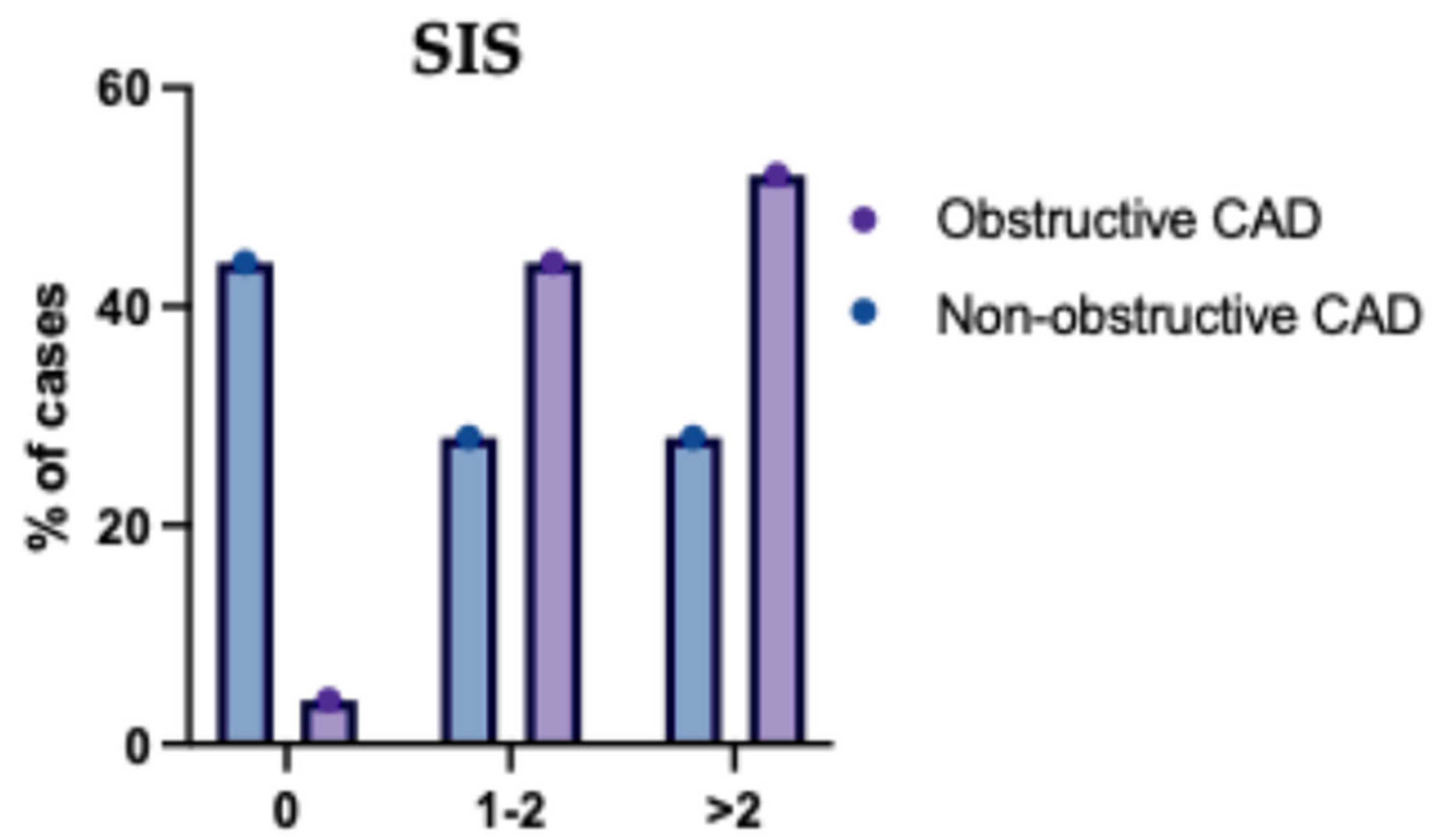 p < 0.001). Mean SIS progressively increased with higher CACS categories (CACS 0: 0.28 ± 1.04; CACS 1–100: 1.25 ± 0.77; CACS > 100: 4.25 ± 0.9), with all pairwise comparisons being statistically significant (
