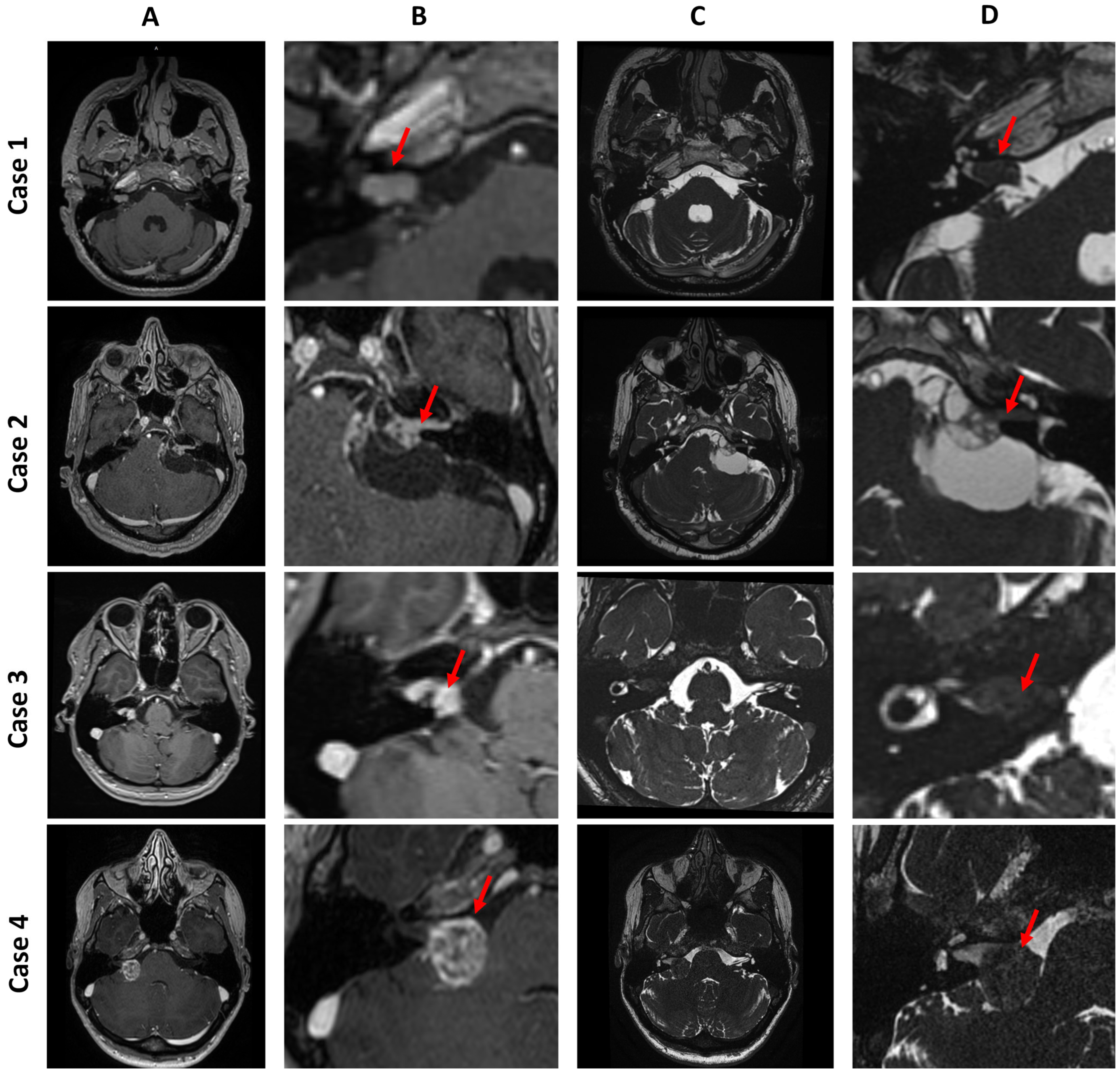 - Case 4 is a Koos III vestibular schwannoma present in the right cerebellopontine angle cistern, occupying less than half of the internal acoustic meatus.