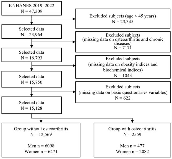 In this large-scale cross-sectional study, we used data from the Korea National Health and Nutrition Examination Survey (KNHANES), which focuses on a national representative sample of the Korean population. The KNHANES provides reliable statistics on basic demographic characteristics, nutritional intake status, chronic disease, biochemical profiles, anthropometric measurements and health examinations, and health behavior and status for the Korean population. Additionally, a complex survey sample design that considers weighting, clustering, and stratification was used to address the KNHANES data to ensure that these data were representative of the entire Korean population. Initially, 47,309 subjects participated in the KNHANES from 2014 to 2019. The target population of the present study was adults aged over 45 years because the prevalence of OA in the Korean population aged under 45 years is very low, and high TyG values increase the incidence of arthritis in the population aged over 45 years []. Subjects with missing values for major variables, such as biochemical profiles, obesity indices, and important sociodemographic and socioeconomic characteristics, were excluded from the final analysis. Ultimately, a total of 15,128 subjects (6575 men and 8553 women) were included in the study. The specific inclusion and exclusion criteria are presented in Figure 1.