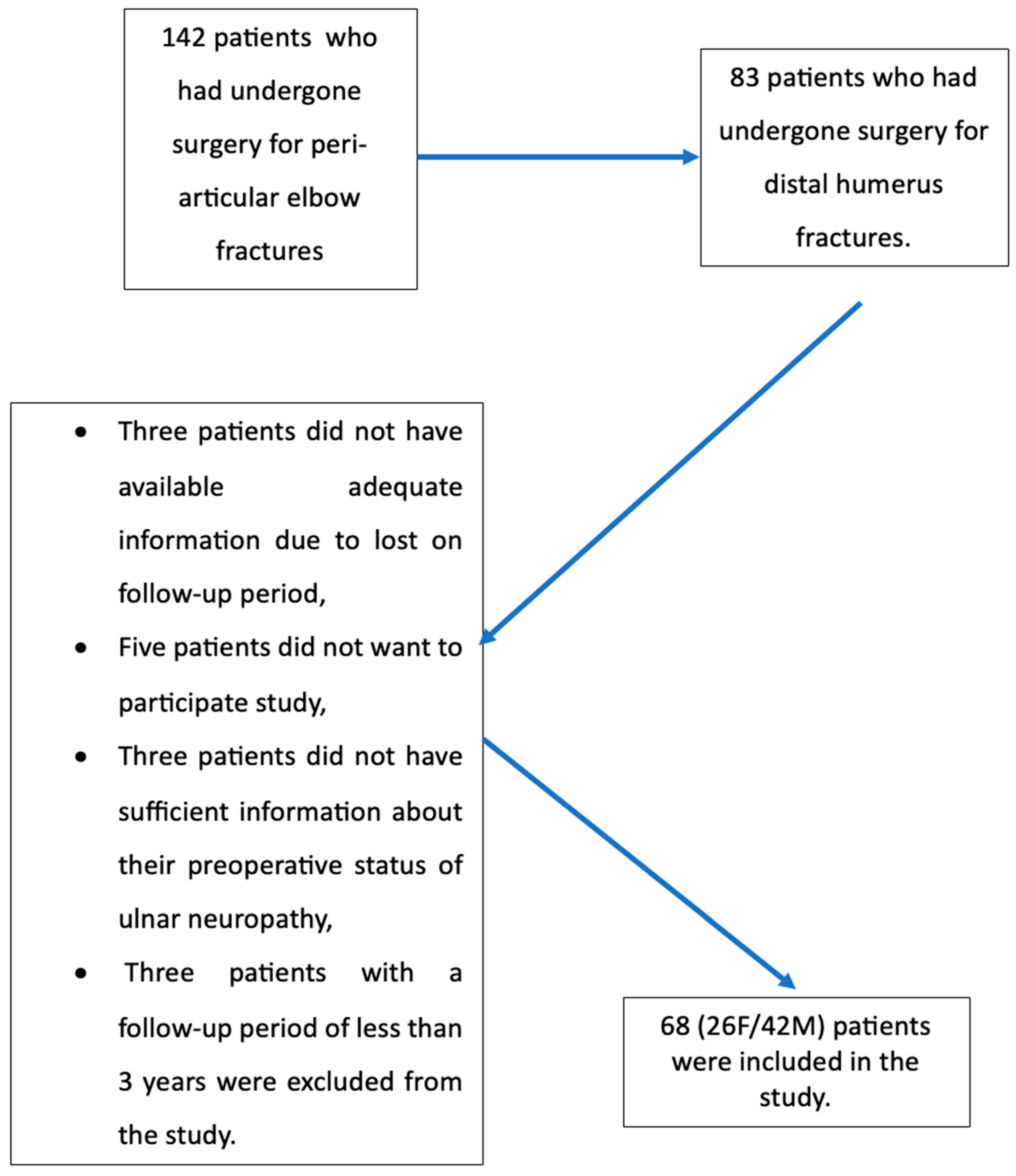 - Ruan, H.-J.; Liu, J.-J.; Fan, C.-Y.; Jiang, J.; Zeng, B.-F. Incidence, Management, and Prognosis of Early Ulnar Nerve Dysfunction in Type C Fractures of Distal Humerus. J. Trauma Acute Care Surg. 2009, 67, 1397–1401. [Google Scholar] [CrossRef]