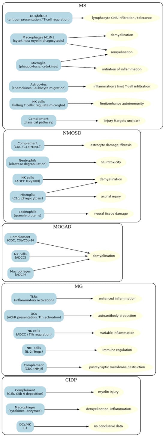 In the disorders analyzed—MS, NMOSD, MOGAD, MG and CIDP—extensive experimental, preclinical and clinical evidence supports the involvement of innate effector mechanisms in both disease initiation and progression. Increasingly detailed characterization of molecular pathways and effector-cell phenotypes underscores their potential as therapeutic targets.