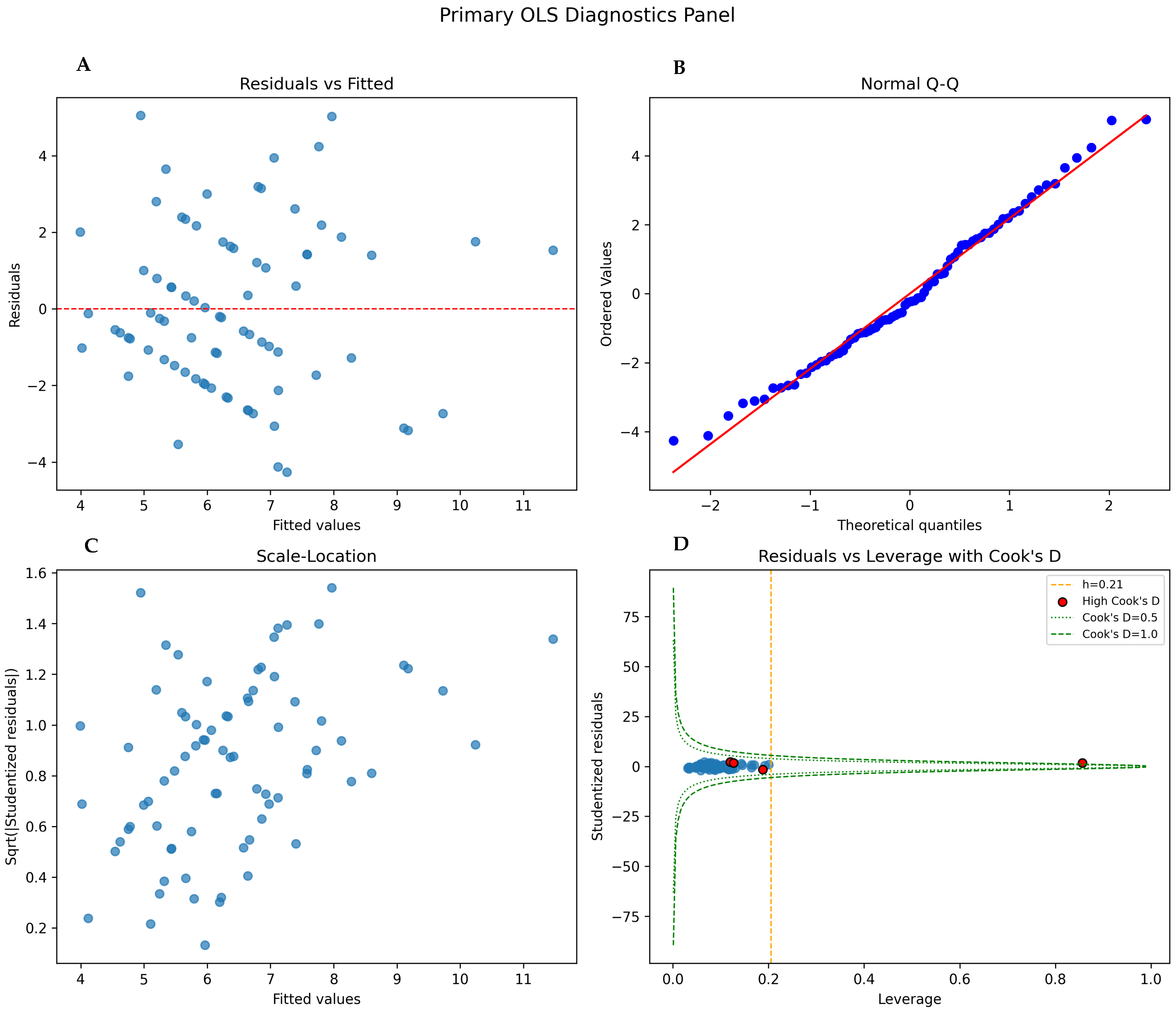 Model diagnostics indicated acceptable OLS assumptions: residuals were approximately normal (Shapiro–Wilk