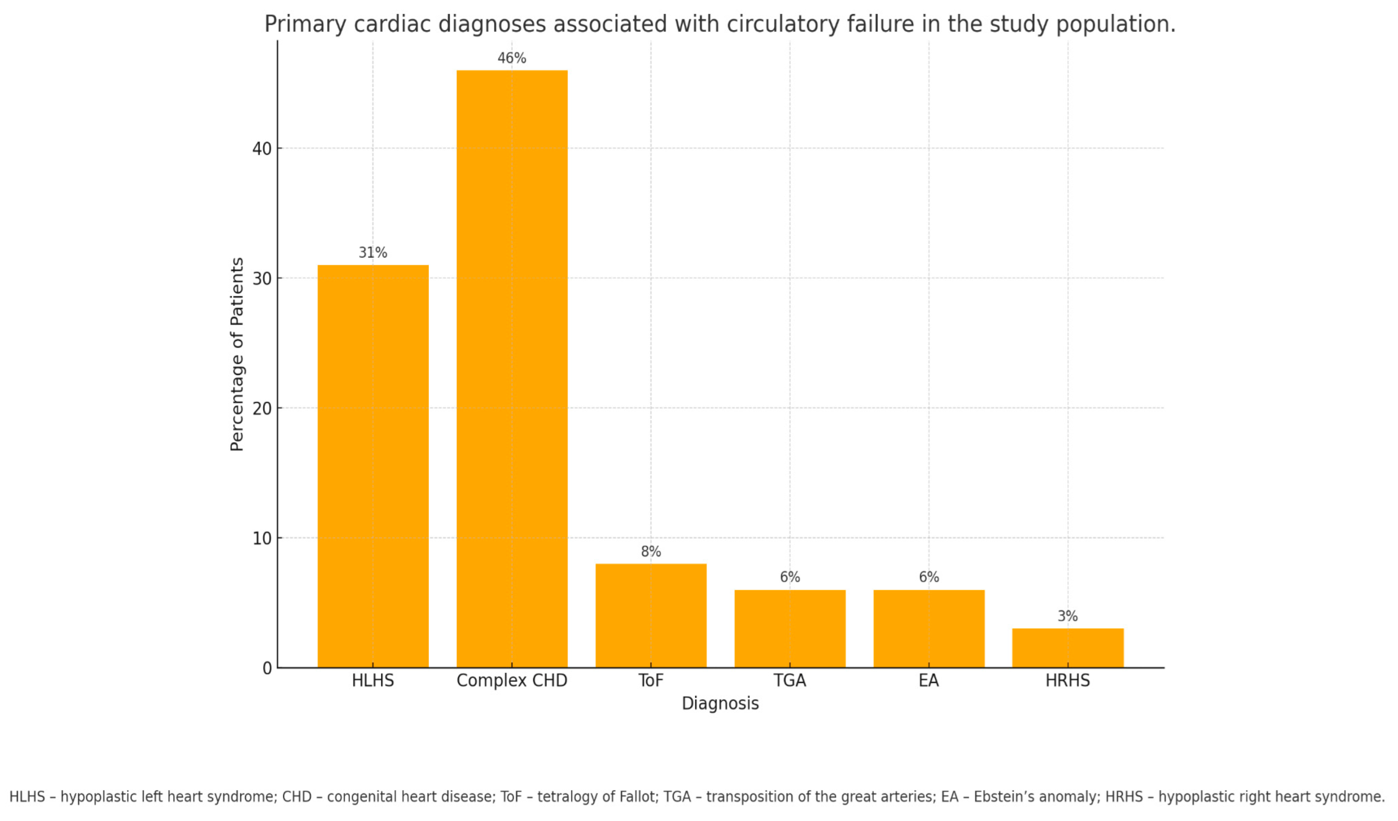 Cardiac defects were the primary cause of ICU admission in 95% of cases. The most common was hypoplastic left heart syndrome (HLHS, 7 patients). Other congenital defects included tetralogy of Fallot (ToF), transposition of the great arteries (TGA), hypoplastic right heart syndrome (HRHS), and Ebstein’s anomaly (EA), comprising 46% of all diagnoses. The distribution of congenital heart defects in the study population is shown in