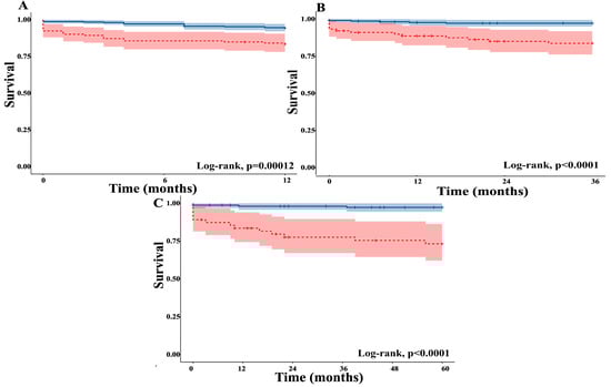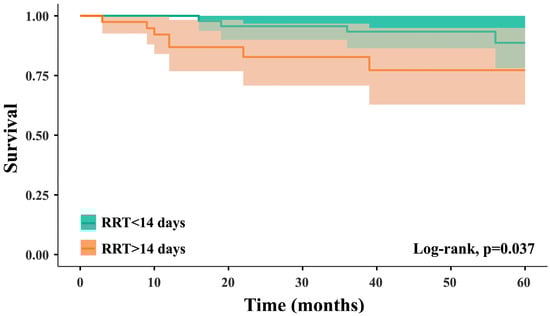 Statistical analysis was performed using Microsoft Excel 365, IBM SPSS Statistics 27 (IBM Corp., Armonk, New York, NY, USA), and Jamovi version 2.3.28 (Open-Source Project, Sydney, Australia). Continuous variables, when normally distributed with equal variances, were expressed as mean ± standard deviation (SD) and compared with Student’s t-test. If these assumptions were not met, data were reported as median and interquartile range (25th and 75th percentiles) and analyzed using the Mann–Whitney U test. Normality was tested with the Shapiro–Wilk test, and homogeneity of variances was tested with Levene’s test. Survival analysis utilized the log-rank test and Kaplan–Meier curves. The analyzed time points included one month, and one-, three-, and five-year intervals. Two-tailed p-values <0.05 were deemed statistically significant.