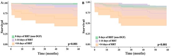 Five-year renal graft (A) and patient (B) survival rates according to the length of renal replacement therapy (RRT) after transplant.