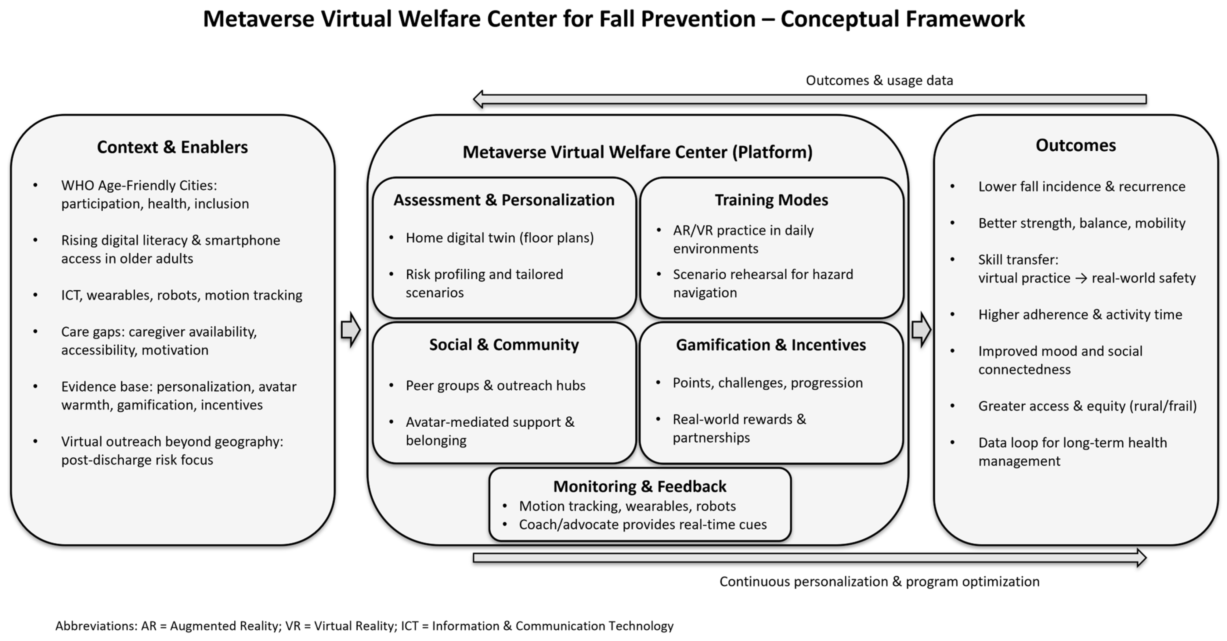 Therefore, innovative platforms such as the metaverse, which provide interactive and safe environments, could effectively address these barriers and improve participation in fall prevention programs. However, despite growing interest in digital and virtual reality interventions, no comprehensive review has systematically synthesized the role of metaverse-based approaches in fall prevention for older adults. This gap highlights the need for the present theoretical review. Accordingly, this study aims to explore and propose a new paradigm for fall prevention exercise programs for older adults by reviewing the potential application of metaverse technology. Specifically, we examine how metaverse-based interventions can overcome the limitations of existing face-to-face and non-face-to-face programs and improve accessibility, engagement, and effectiveness in fall prevention for older adults.