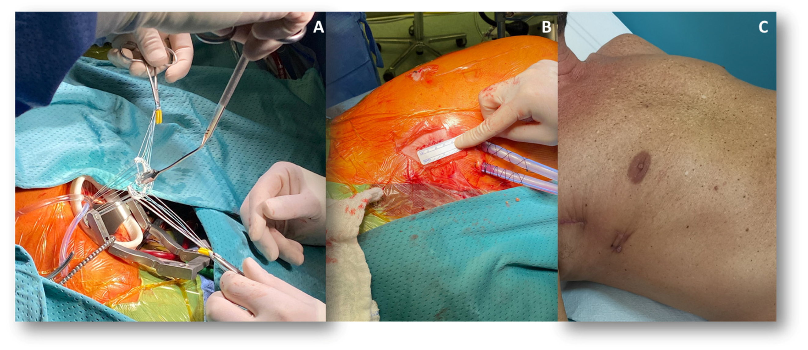 Figure 1. Minimally Invasive Mitral Valve Repair via Right Mini-Thoracotomy. (A) shows the positioning of a mitral annuloplasty band through right mini-thoracotomy access. (B) depicts the final result of the repair with drains in place and the incision sutured following removal of the retractor and surgical instruments. (C) illustrates the final surgical scar, demonstrating a superior cosmetic outcome compared with median sternotomy and reduced impact for the patient.