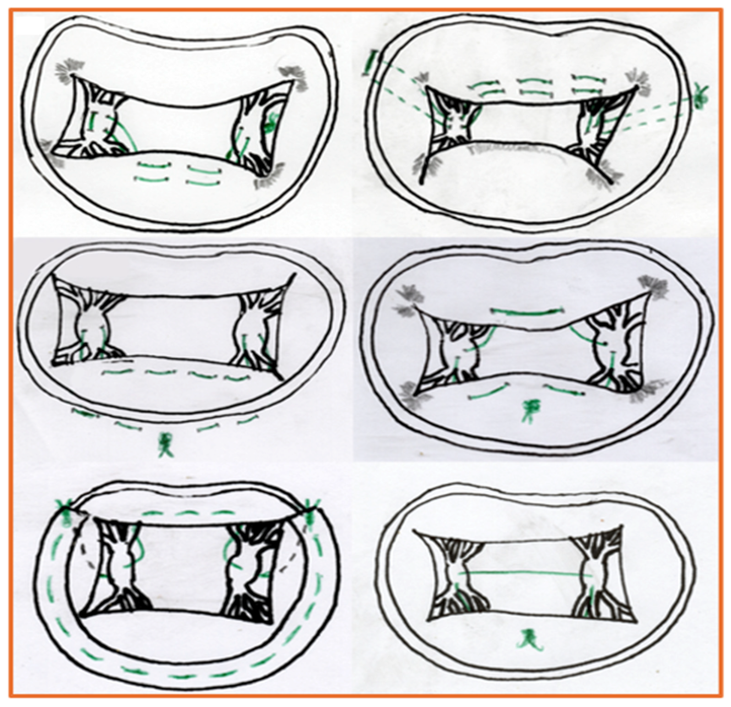 Figure 3. Schematic Illustration of Some Different Techniques of Surgical Cordal Implantation. From the top left, moving clockwise, the following surgical techniques are represented: Roman Arch, Minotaurus, “V” technique, Square, ARGO, and Corset. The sutures are represented in green. In some cases a dashed line was traced to better delineate the route of the suture.