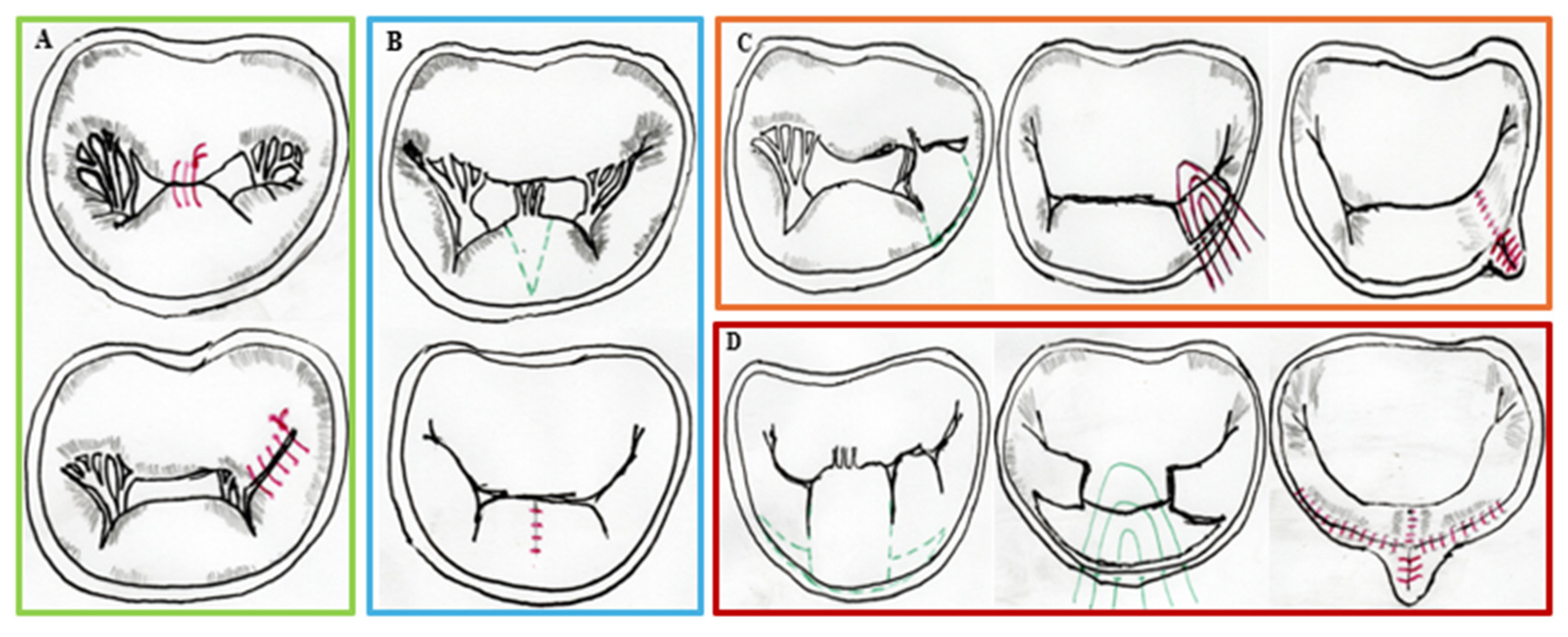 Figure 4. Schematic Illustrations of Principal Techniques Employed in SMVr. (A) Edge-to-edge suture, also known as Alfieri’s suture, in A2-P2 (top) and A3-P3 (bottom) positions. (B) Triangular resection. The green dashed lines indicate the site at which leaflet resection is performed (top). The parallel continuous red lines represent subsequent leaflet suturing following resection (bottom). (C) Quadrangular resection with annulus plication. The green dashed lines represent the site (P2M2-P3) at which resection will be performed. The continuous red lines are the annulus plication sutures that are going to be placed. The parallel continuous red lines represent the sutures at the end of the repair. (D) Quadrangular resection with sliding plasty. The site of resection is demarcated by the dashed green lines. The continuous green line represents the suture threads. The red lines denote the final results.