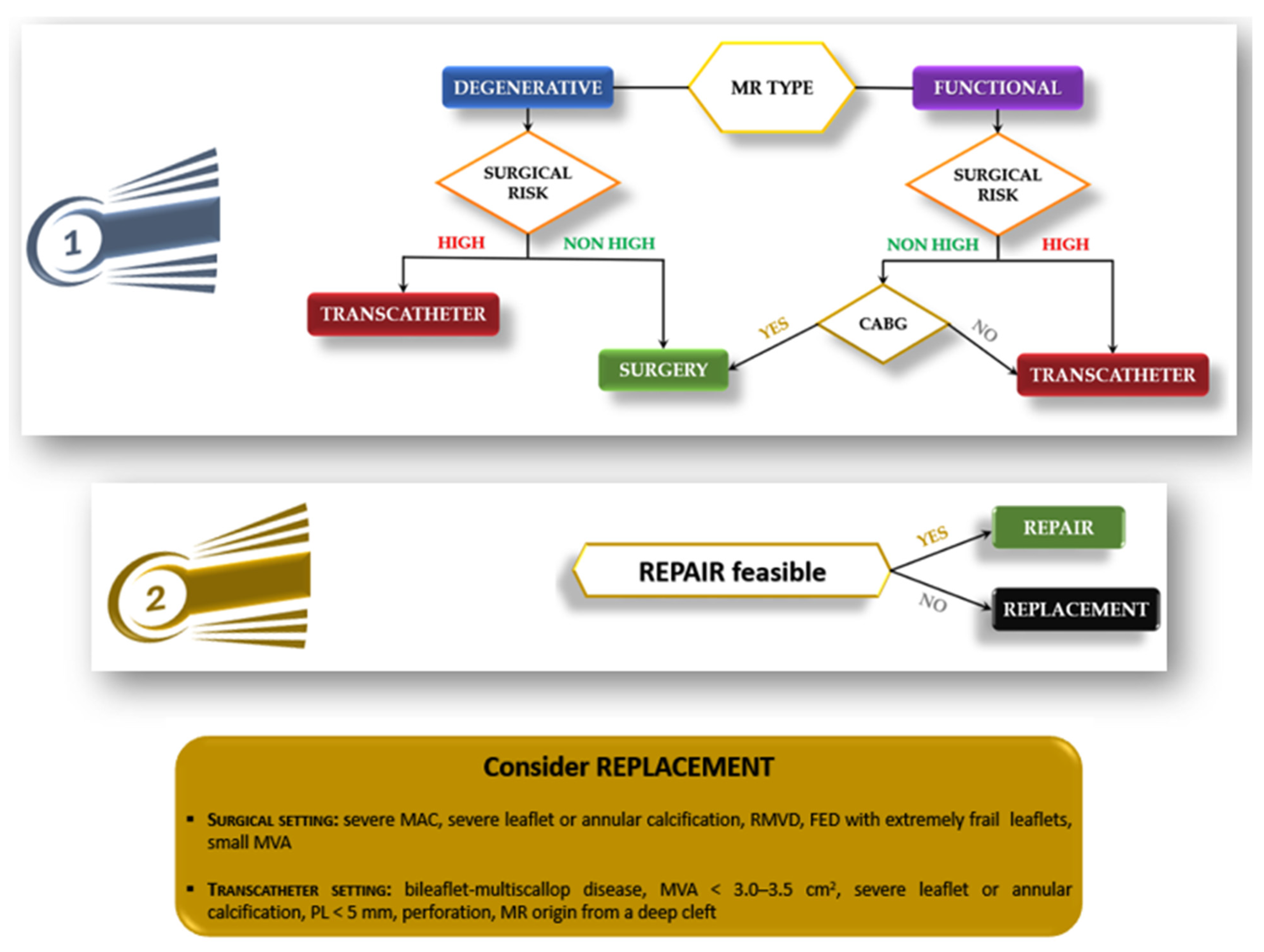 Figure 5. Flowchart Illustrating the Treatment Strategy for MR. (1) The initial step is based on the underlying etiology (DMR vs. FMR) and the patient’s surgical risk, guiding the choice between the surgical or transcatheter approach. (2) Once intervention is indicated, the decision between repair and replacement depends on feasibility and on specific anatomical conditions where valve replacement should be considered (highlighted in the yellow box).