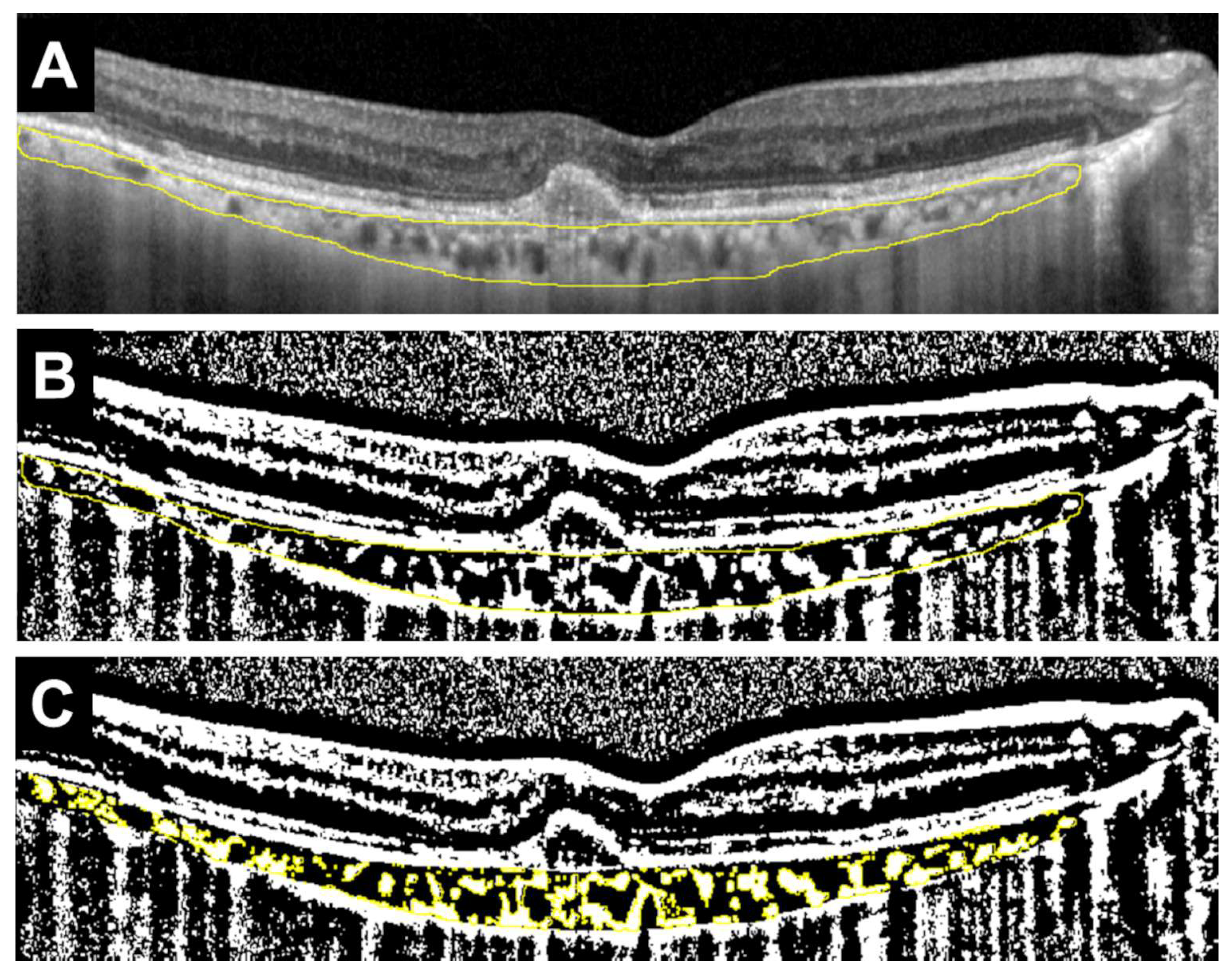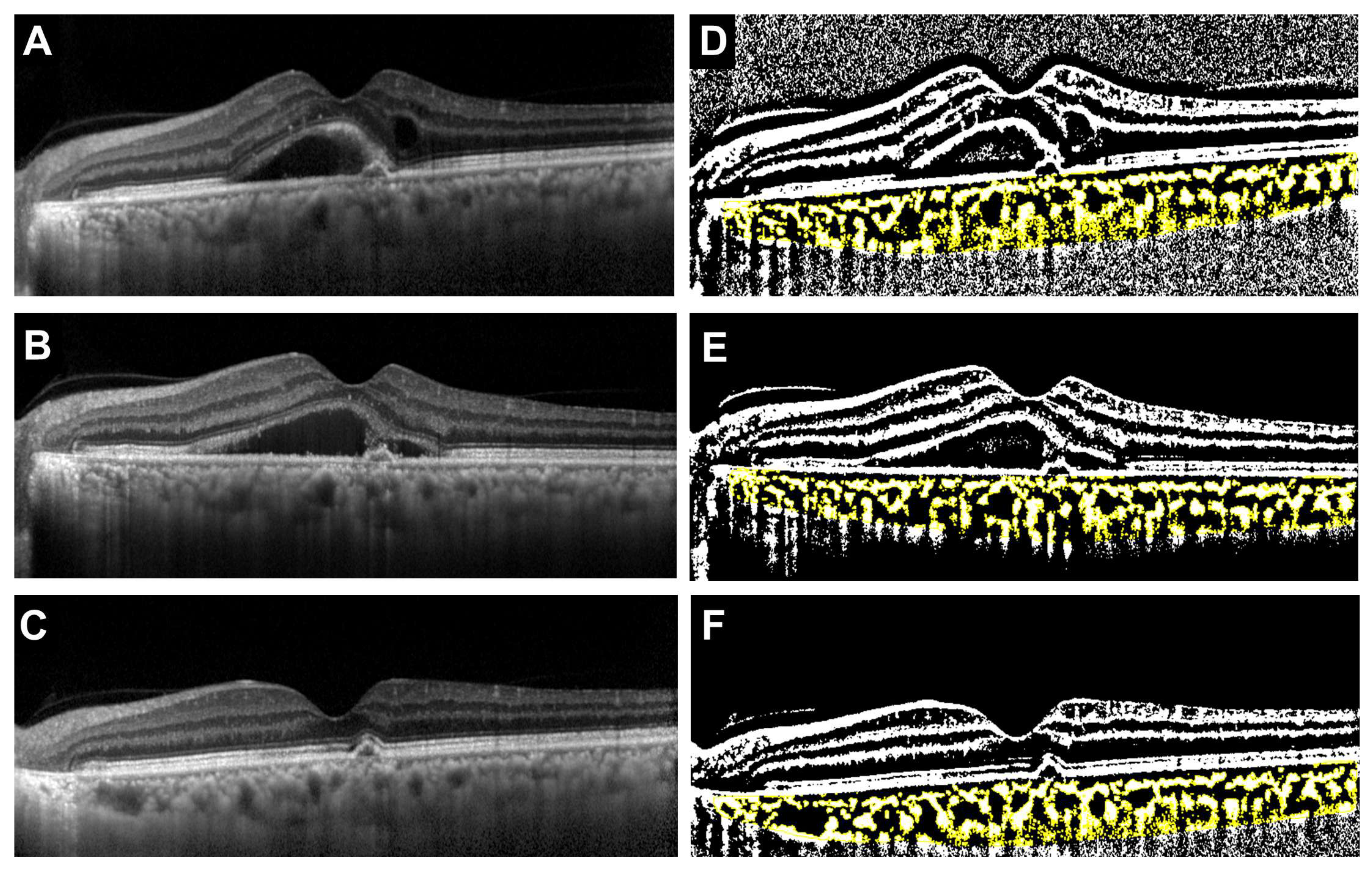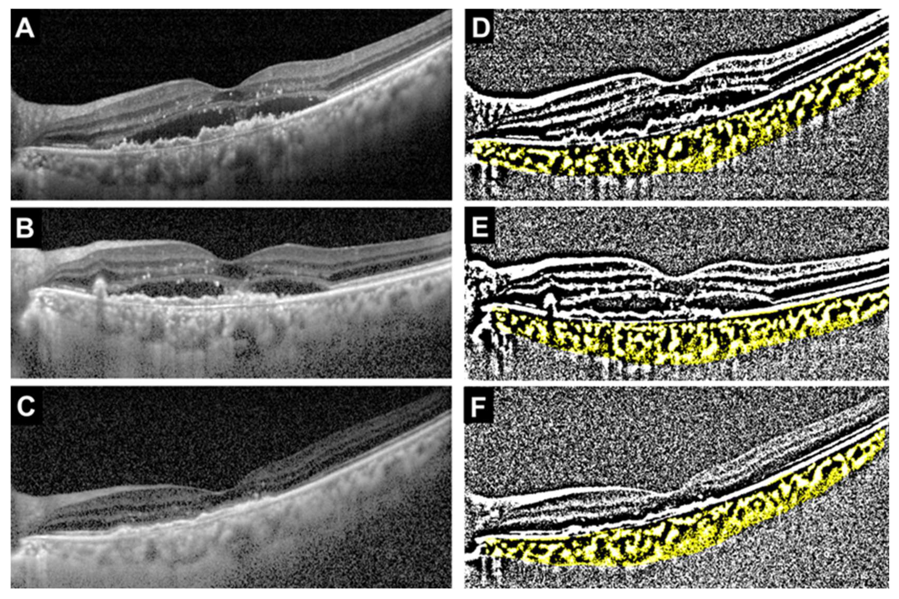 - Sonoda, S.; Sakamoto, T.; Yamashita, T.; Shirasawa, M.; Uchino, E.; Terasaki, H.; Tomita, M. Choroidal structure in normal eyes and after photodynamic therapy determined by binarization of optical coherence tomographic images. Investig. Opthalmol. Vis. Sci. 2014, 55, 3893–3899. [Google Scholar] [CrossRef]