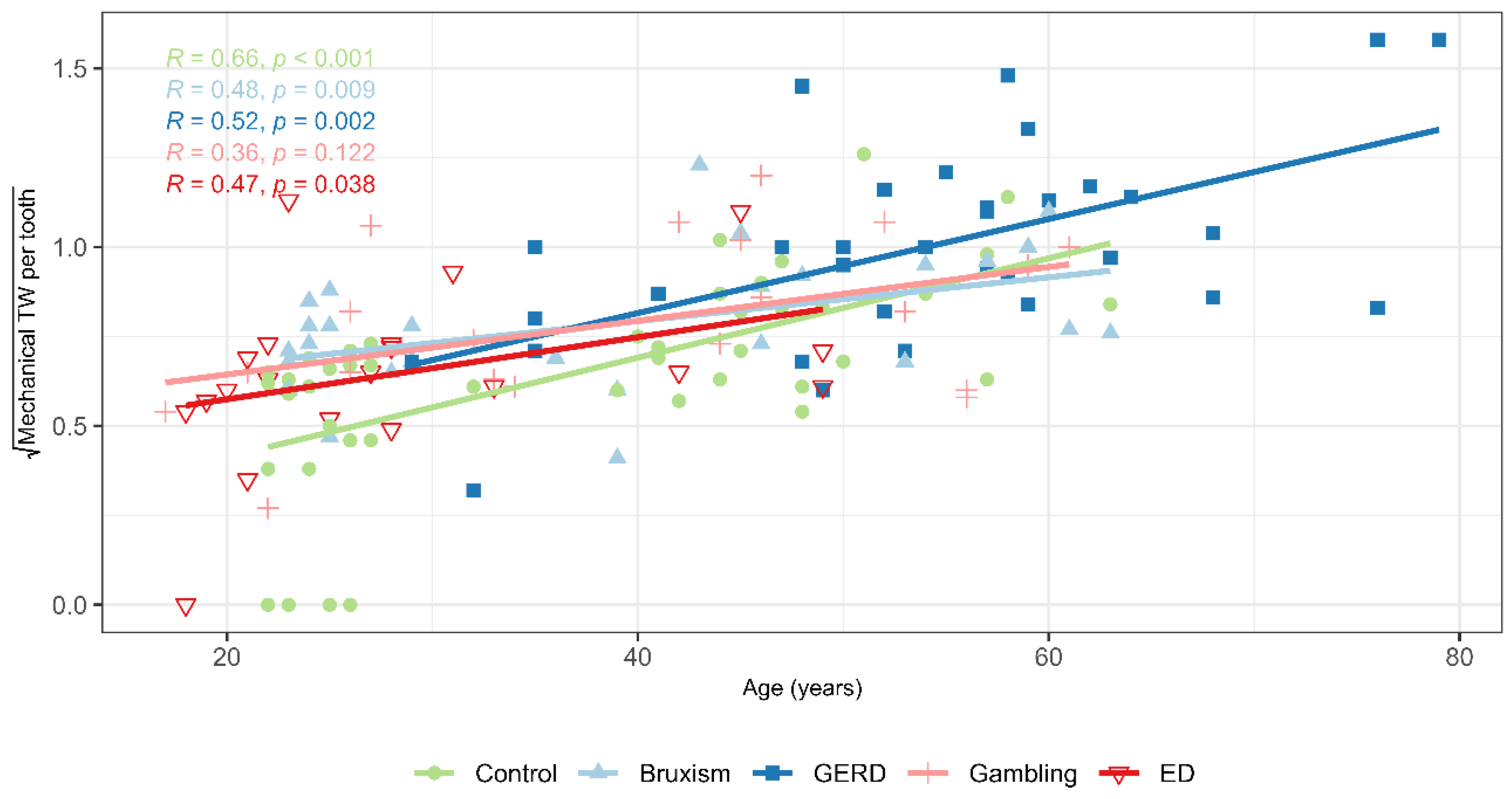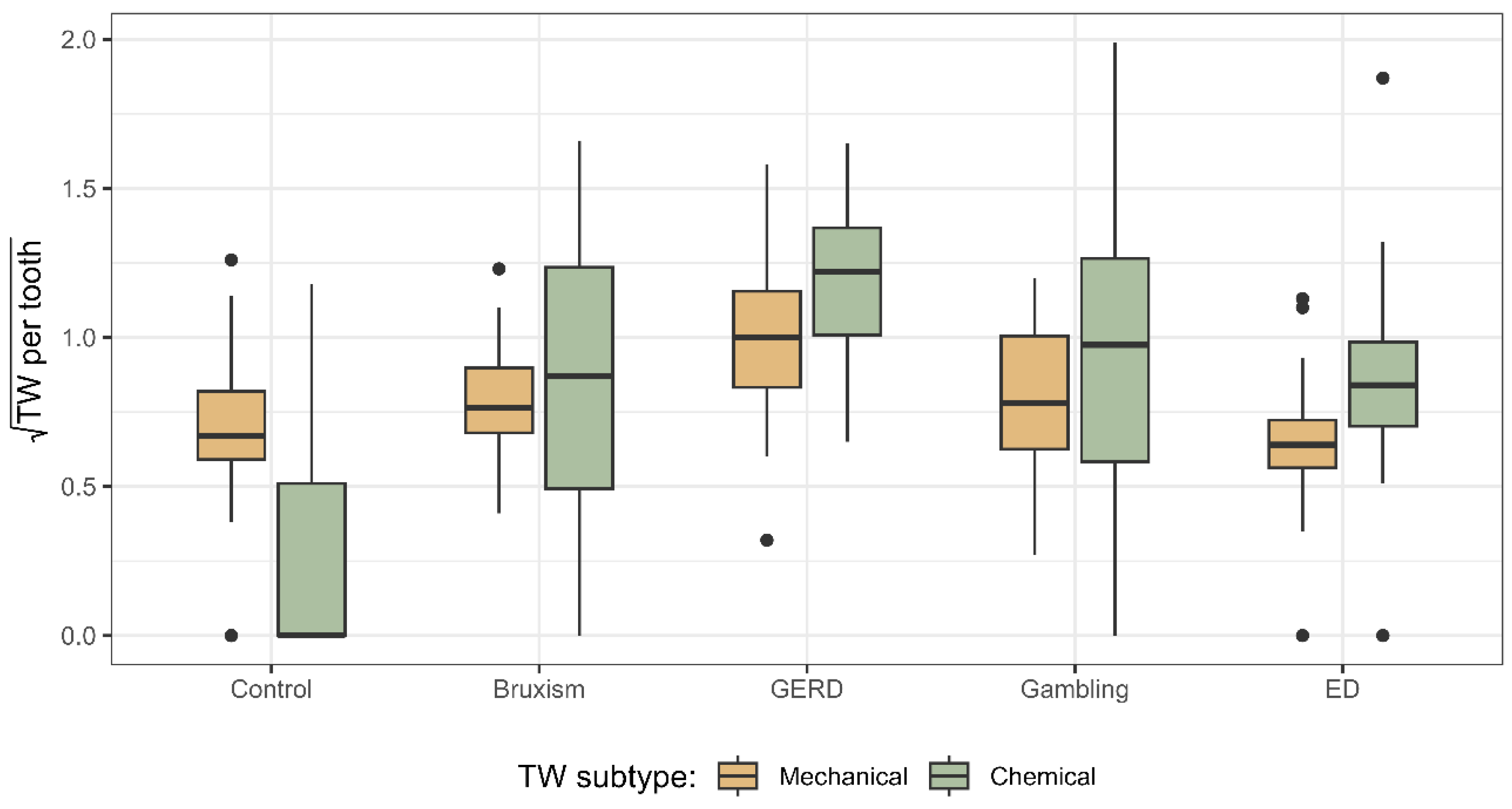 By contrast, ED, Gambling, and Sleep Bruxism groups showed mechanical TW severity comparable to controls. Although these populations are associated with stress, anxiety, and bruxism, the bruxism itself tends to be intermittent and when it occurs predominantly in a centric pattern, the limited duration of tooth contact may reduce clinically detectable mechanical wear [