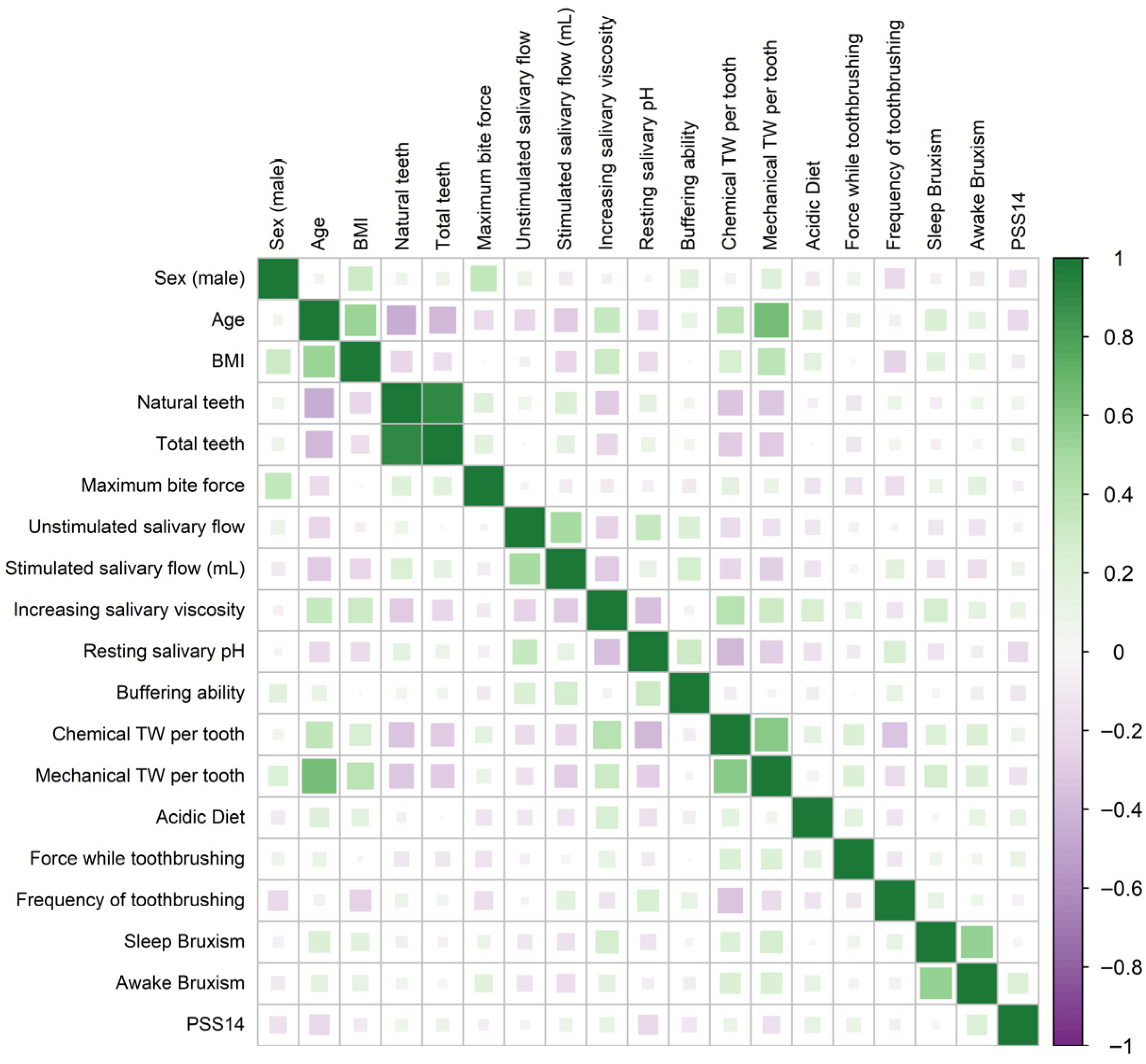 In the present study, age was positively associated with BMI, acidic dietary habits, SB, salivary dehydration, and increased viscosity, and while it was negatively associated with the number of teeth, perceived stress, salivary pH, and flow rate. Trends in overweight status, behavioural factors, and age-related physiological changes in salivary function may contribute to an elevated risk of TW in older adults [