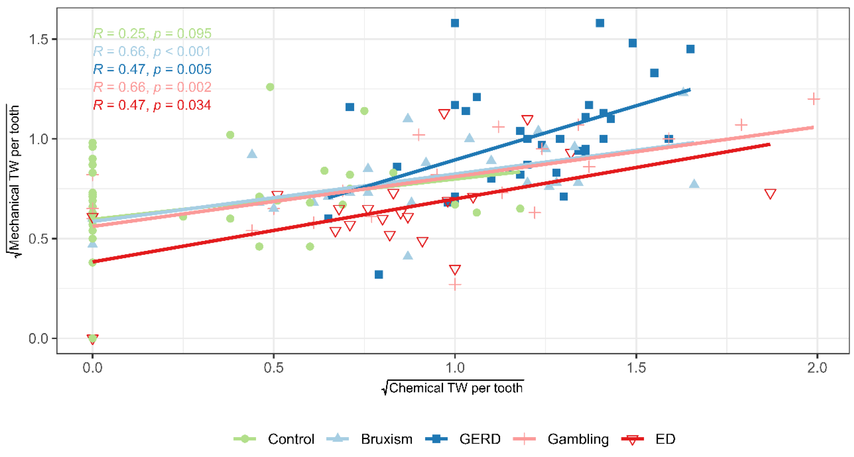 The results showed a strong association between the severity of chemical and mechanical TW per tooth, especially in high-risk groups, consistent with previous studies. Rius-Bonet et al. [