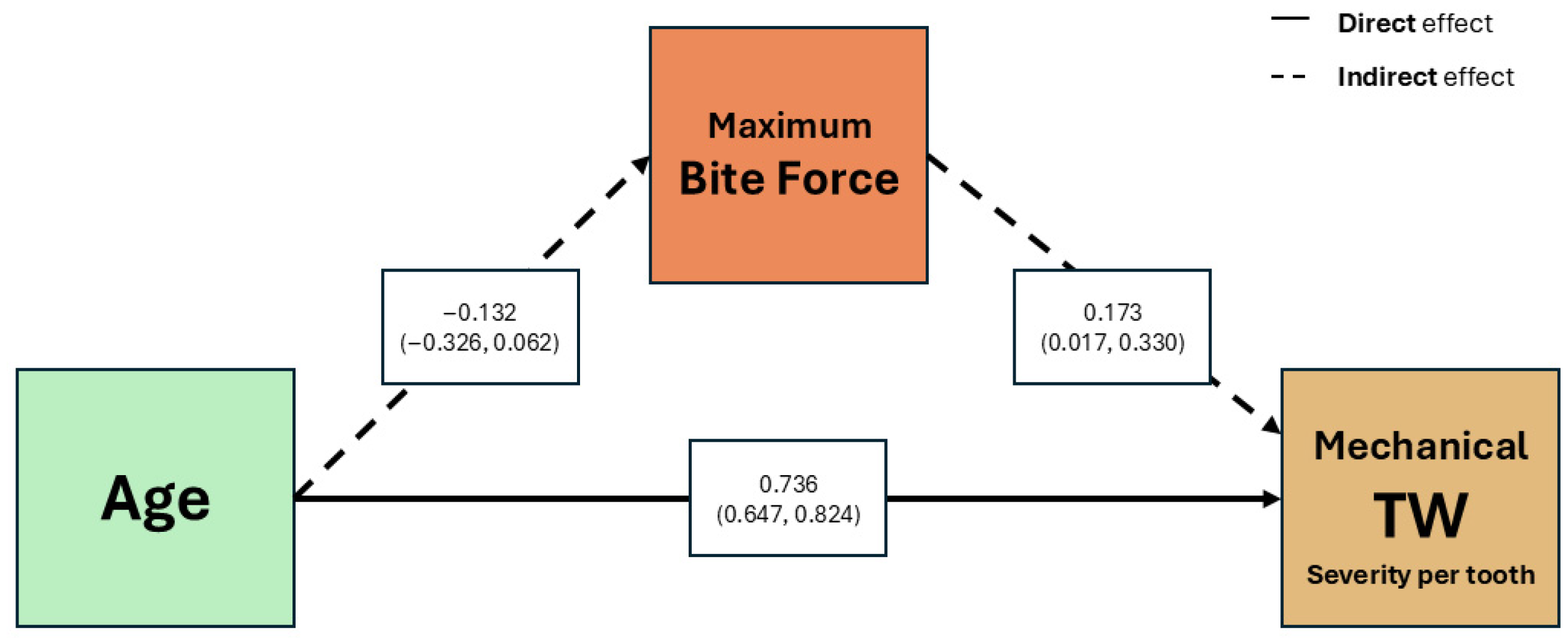 78] found risk group membership, such as GERD, to be a significant determinant of dental erosion. Collectively, these findings suggest that salivary pH may be a potential indicator of TW risk. The mediation model assessing maximum bite force as a link between age and mechanical TW showed both age and bite force positively associated with wear per tooth, even after adjusting for sex. However, no significant indirect effect of age through bite force was found. These findings are consistent with previous evidence identifying age as a marker of cumulative exposure and bite force as an indicator of occlusal load intensity, both exerting separate effects on structural dental loss [