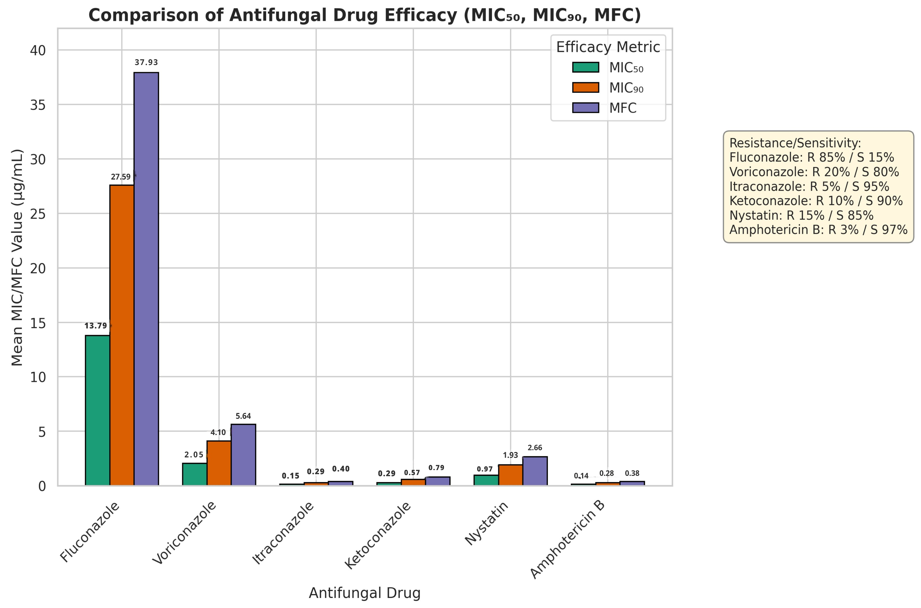 Antifungal susceptibility profiles were observed using the broth microdilution method following Clinical and Laboratory Standards Institute (CLSI) M27-A3 guidelines. The antifungal agents that were tested include Fluconazole, Voriconazole, Itraconazole, Ketoconazole, Nystatin, and Amphotericin B. Each isolate was analyzed for Minimum Inhibitory Concentration at 50% (MIC50), Minimum Inhibitory Concentration at 90% (MIC90), and Minimum Fungicidal Concentration (MFC). MICs were interpreted according to the CLSI cutoff point, where obtainable. MFCs were determined by subculturing 100 µL from wells with no visible growth onto fresh SDA plates and assessing colony formation after 48 h. The lowest concentration resulting in ≥99.9% reduction in colony-forming units was defined as the MFC.
