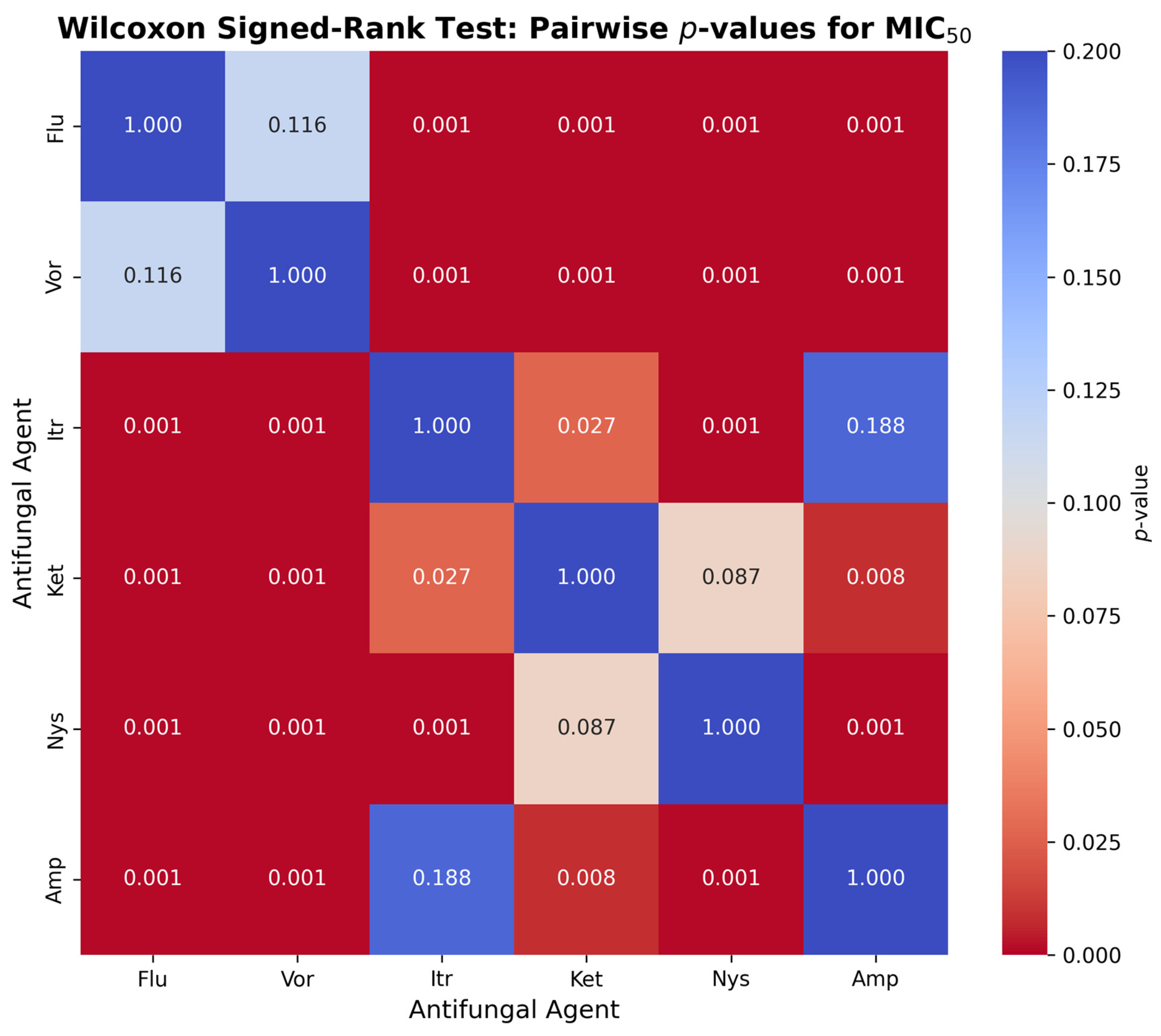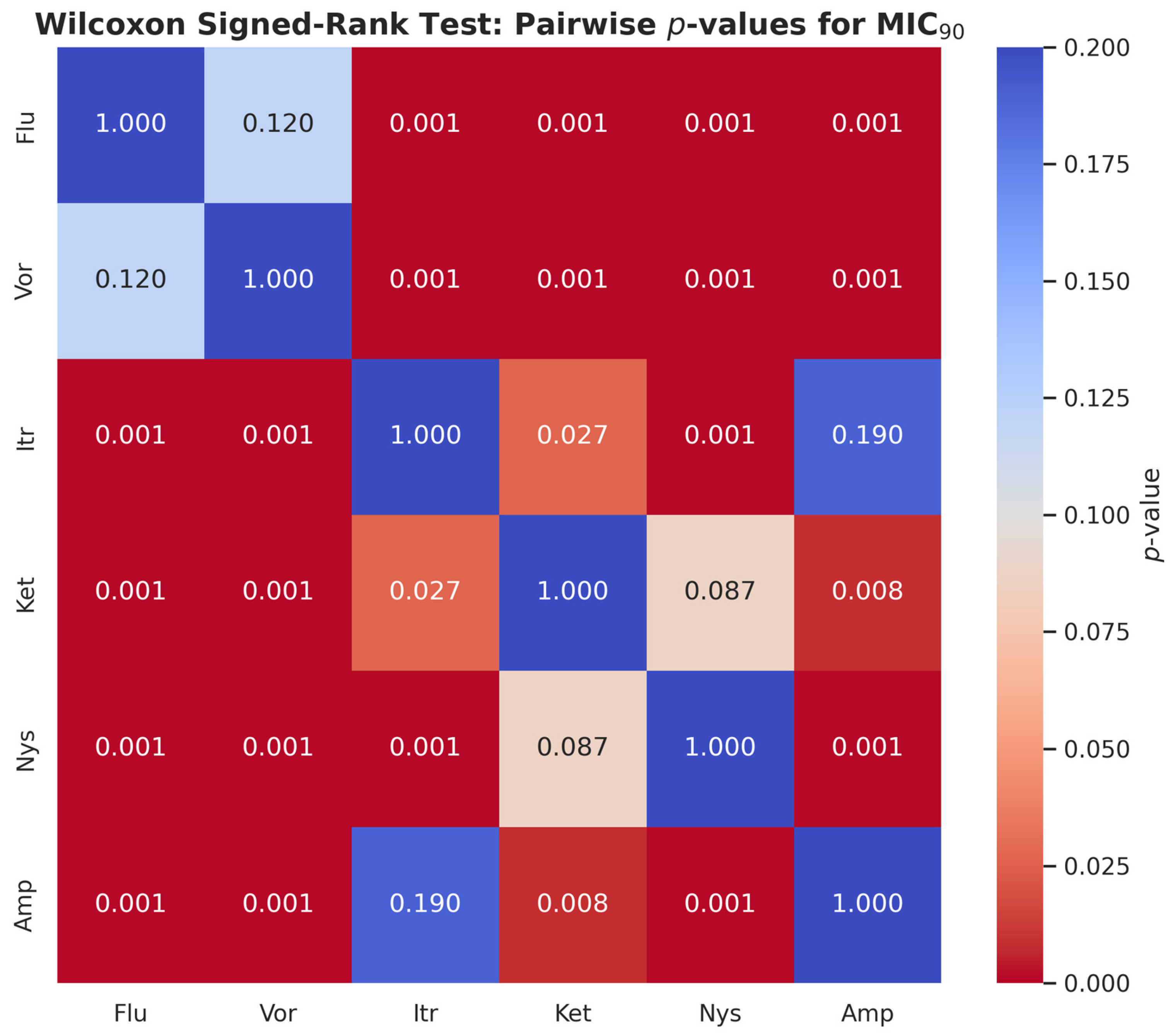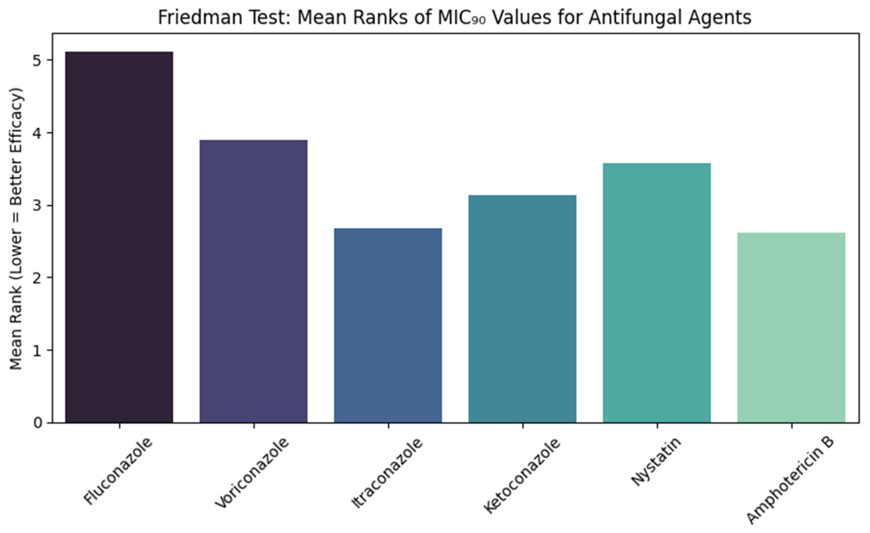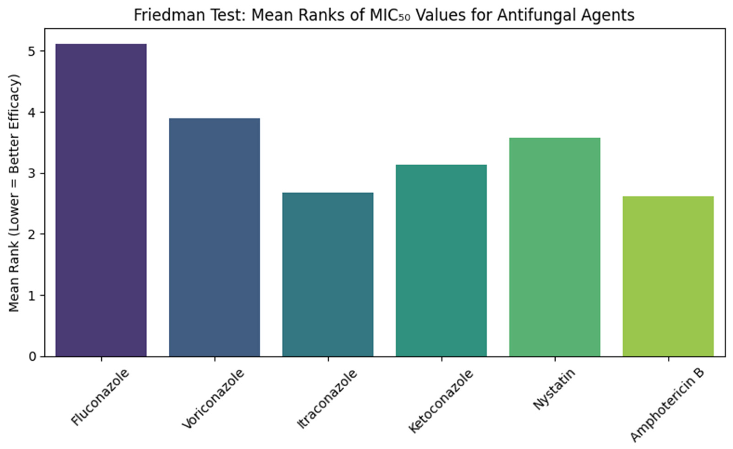 Figure 2 shows the results of the Friedman test comparing the Minimum Inhibitory Concentration (MIC) of six antifungal agents against