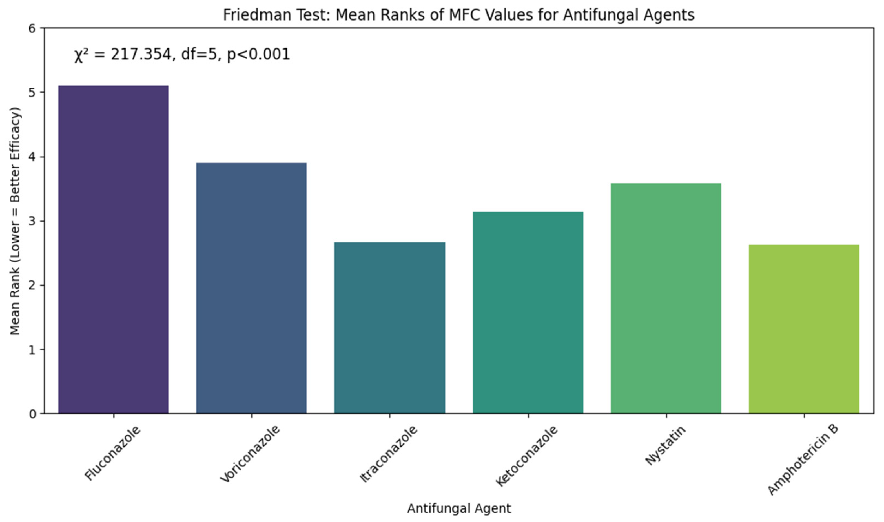 Notably, the fact that the findings are based on statistical analyses enhances their validity. The Friedman test confirmed significant between-group differences across the antifungal agents (χ