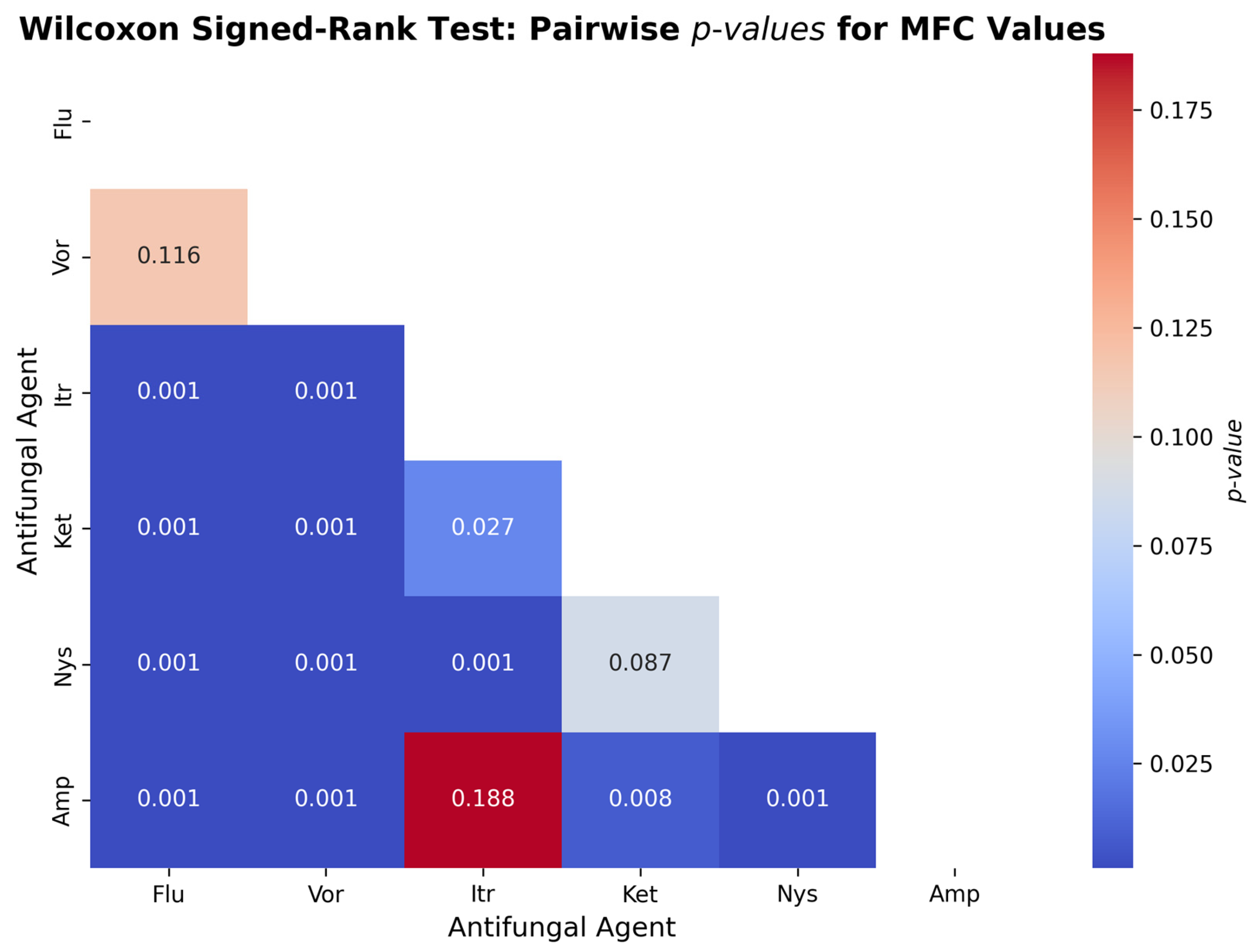 Figure 7 illustrates the outcome of the Wilcoxon signed-rank test that has been conducted to examine the difference in the Minimum Fungicidal Concentration (MFC) values of six antifungal agents examined on the