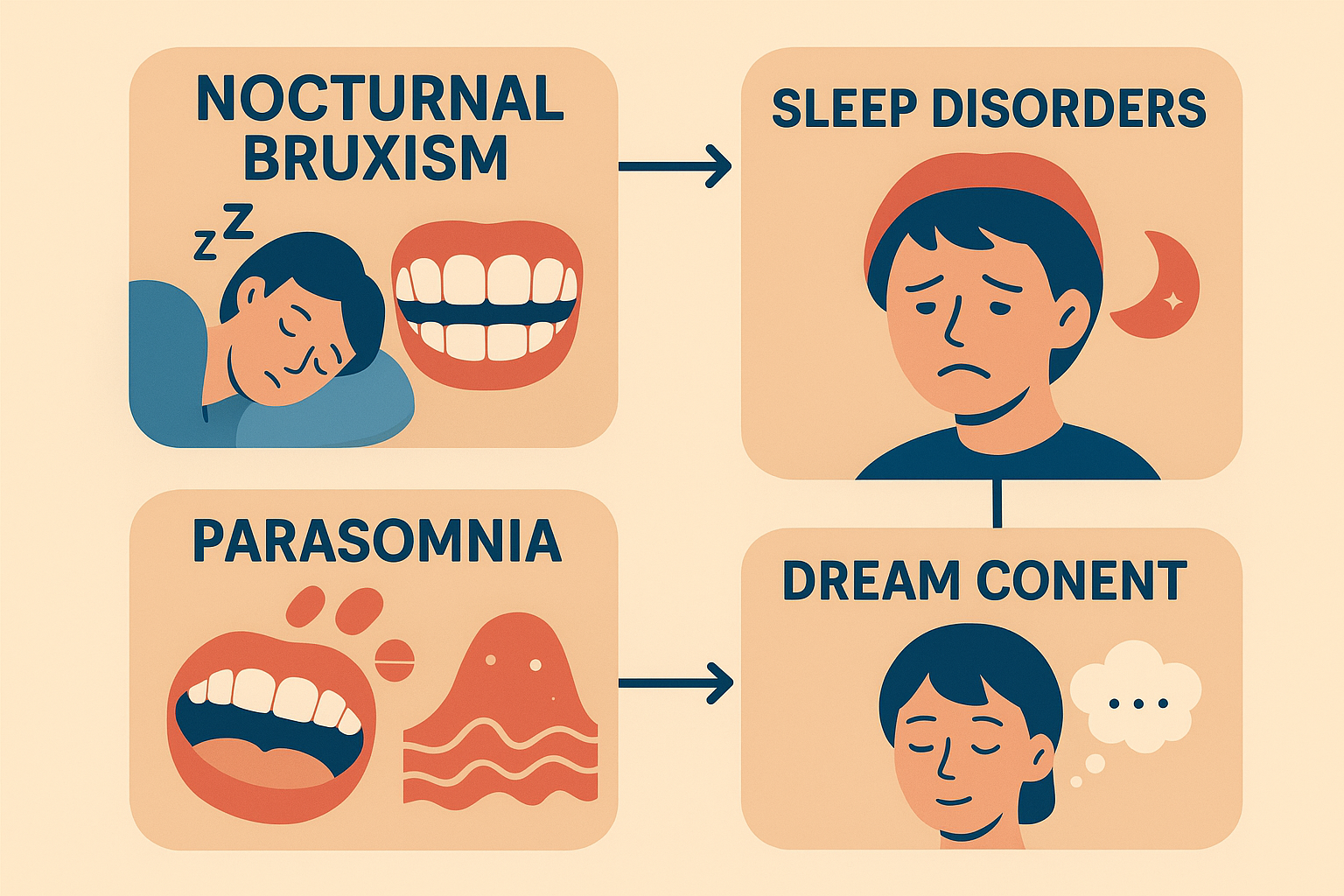 The present study demonstrated significant associations between the severity of bruxism, insomnia, parasomnias, and the nature of dreams. Although individuals with bruxism were not significantly more likely to report insomnia symptoms than those without this condition, a clear positive association was observed between the intensity of bruxism and insomnia severity. Bruxism was also significantly related to the frequency of parasomnias and to the occurrence of dreams involving oral sensations and physical discomfort, suggesting shared physiological or psychological mechanisms.