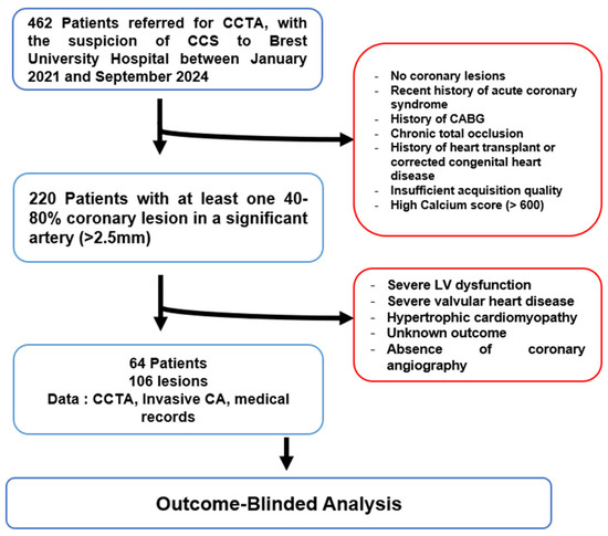 This retrospective observational outcome-blinded study was conducted at Brest University Hospital between January 2021 and September 2024. Patients referred for CCTA due to suspected chronic coronary syndrome (CCS), who subsequently underwent ICA, were included. The local Institutional Ethics Committee approved the study protocol, which was based on Reference Methodology (MR004), as defined by the French Data Protection Authority (CNIL), and patient data were anonymized in compliance with institutional regulations (Figure 1).