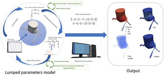 Recent advancements in computational modeling, based on Computational Fluid Dynamics (CFD), have enhanced the diagnostic utility of anatomical imaging by simulating coronary flow and pressure [13]. Quantitative Flow Ratio (QFR), based on ICA, and Computed Tomography Fractional Flow Reserve (FFRCT), based on coronary computed tomography angiography (CCTA), both use CFD models to estimate the functional significance of coronary stenoses [14,15]. These techniques have demonstrated improved diagnostic accuracy by offering both anatomical and functional insights with an acceptable cost-effectiveness ratio [16]. However, the performance of a model relies heavily on the defined boundary conditions (BCs). Most available commercial software uses theoretical assumptions and idealized parameters, which can miss the patient-specific setting. When clinical data are accessible, using patient-specific BCs is preferable over generalized or estimated parameters, which produce more realistic flow/pressure curves, particularly near side branches and curvatures where atherosclerotic plaques commonly form [17].