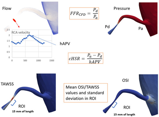 Computational analysis illustrating key parameters: FFRCFD: Fractional Flow Reserve via Computational Fluid Dynamics; hAPV: Hyperemic Average Peak Velocity; cHSR: Computational Hemodynamic Stenosis Resistance; Pd: Distal Pressure, Pa: Proximal Pressure; TAWSS: Time-Averaged Wall Shear Stress; OSI: Oscillatory Shear Index; ROI: Region of Interest, 15 mm of vessel length beyond peak stenosis.