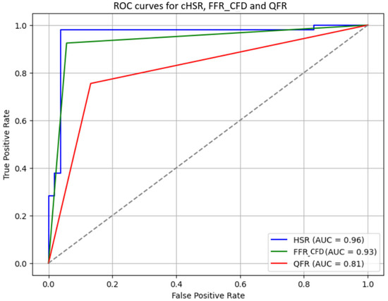 The DeLong test was used to statistically compare the areas under the ROC curves (AUCs) of cHSR, FFRCFD, and QFR. The results showed that cHSR had a significantly higher AUC compared to both FFRCFD (z = 19.27, p < 0.001) and QFR (z = 16.55, p < 0.001), further confirming its superior diagnostic performance in predicting the necessity of revascularization.