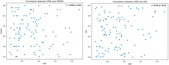 The relationship between cHSR and the shear stress parameters TAWSS and OSI was evaluated. No significant correlation was found between cHSR and TAWSS (r = −0.05, p = 0.61), nor between cHSR and OSI (r = 0.14, p = 0.16) (Figure 6).