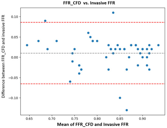 A Bland-Altman analysis was used to assess the agreement between FFRCFD and invasive FFR, revealing good agreement with a Pearson correlation coefficient of 0.87 (p < 0.0001), indicating strong linear correlation. The plot confirmed minimal bias (mean difference + 0.01), supporting the validity of the computational FFRCFD measurements.