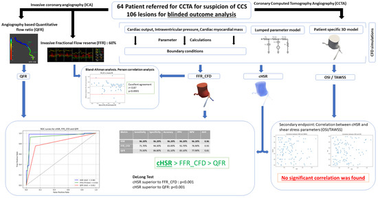 Central illustration: CCS: Chronic Coronary Syndrome; CCTA: Coronary Computed Tomography Angiography; ICA: Invasive Coronary Angiography; QFR: Quantitative Flow Ratio; FFR: Fractional Flow Reserve; FFRCFD: Fractional Flow Reserve derived from Computational Fluid Dynamics; cHSR: Computational Hyperemic Stenosis Resistance; OSI: Oscillatory Shear Index; TAWSS: Time-Averaged Wall Shear Stress; CFD: Computational Fluid Dynamics; AUC: Area Under the Curve; PPV: Positive Predictive Value; NPV: Negative Predictive Value.