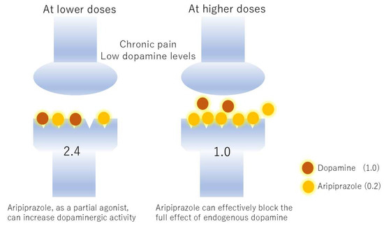 Reversal of the effects of aripiprazole by different dopamine concentrations. Suppose dopamine transmits a stimulus of 1.0 and aripiprazole transmits 0.2. In chronic pain, dopamine function is reduced, setting the dopamine concentration to 2. At low doses, aripiprazole supplements dopamine transmission, resulting in a transmission of 2.4. However, at high doses, aripiprazole pushes aside the small amount of dopamine, occupying the receptors and reducing transmission to 1.0. The former is an agonist effect and the latter is an antagonist effect.