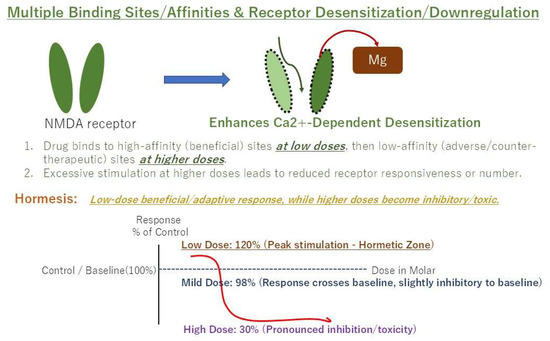 Pharmacological interventions for BMS often involve off-label use of medications primarily developed for psychiatric disorders, such as antidepressants and atypical antipsychotics. In Japan, amitriptyline monotherapy is the most commonly employed drug treatment for BMS [4], with aripiprazole being increasingly utilized in combination therapy for refractory cases [5]. However, a notable observation in the clinical management of BMS with these drugs is that their therapeutic efficacy does not always follow a conventional dose-dependent linear or sigmoid curve [6]. Instead, studies and clinical experience suggest a non-sigmoid (U-shaped or bell-shaped) dose–response relationship, indicating the existence of a clinically effective dose that is often considerably lower than the doses typically used for their primary indications [7]. This phenomenon challenges traditional pharmacological assumptions and underscores the critical need for personalized medicine in the treatment of BMS. This paper aims to explore the intricate mechanisms behind the non-dose-dependent pharmacological actions of amitriptyline and aripiprazole in BMS. We will delve into their specific interactions with neurotransmitter systems and receptors, particularly NMDA and dopamine D2 receptors, which are important receptors as therapeutic targets in BMS [8], to explain why a personalized therapeutic window, rather than maximal dose, is paramount for achieving sustained therapeutic benefits and improving treatment continuation rates. Furthermore, we will emphasize how these insights pave the way for a more individualized approach to managing this complex and debilitating condition. The discussion will unify the underlying mechanisms for both drugs—NMDA antagonism and D2 partial agonism—under the framework of hormesis to provide a clear rationale for the non-linear pharmacodynamics observed in BMS treatment.