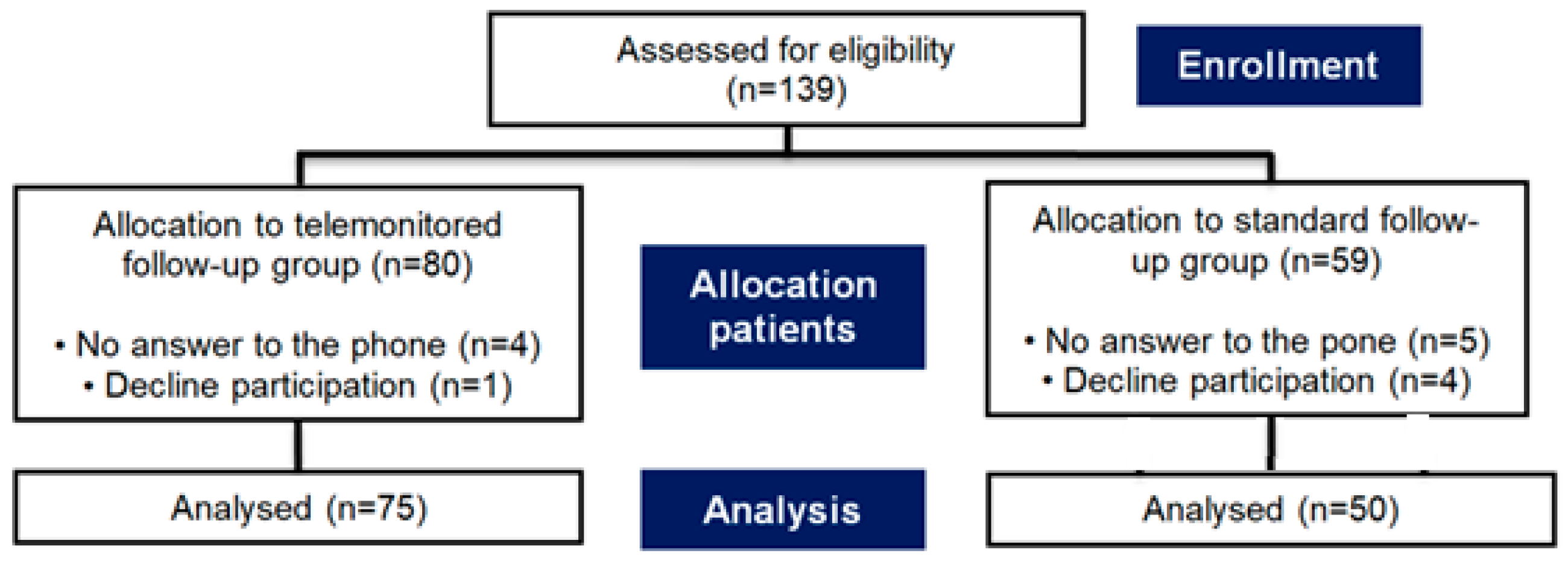 - Dalli-Peydró, E.; Muñoz-Ramos, N.; Fresneda-Fresneda, A.; Serrats-López, R.; Herrera-Vázquez, A.; Rubio-Sánchez, A.; de la Fuente-Rivas, F.; Pellicer-Iborra, V.; Ramírez-Candela, S.; Llanos-Garaboa, A. Extended telemonitoring after acute coronary syndrome improves the patient experience and reduces outpatient visits. In Proceedings of the Annual Meeting of the Clinical Cardiology Association of the Spanish Society of Cardiology, Barcelona, Spain, April 2024. [Google Scholar]