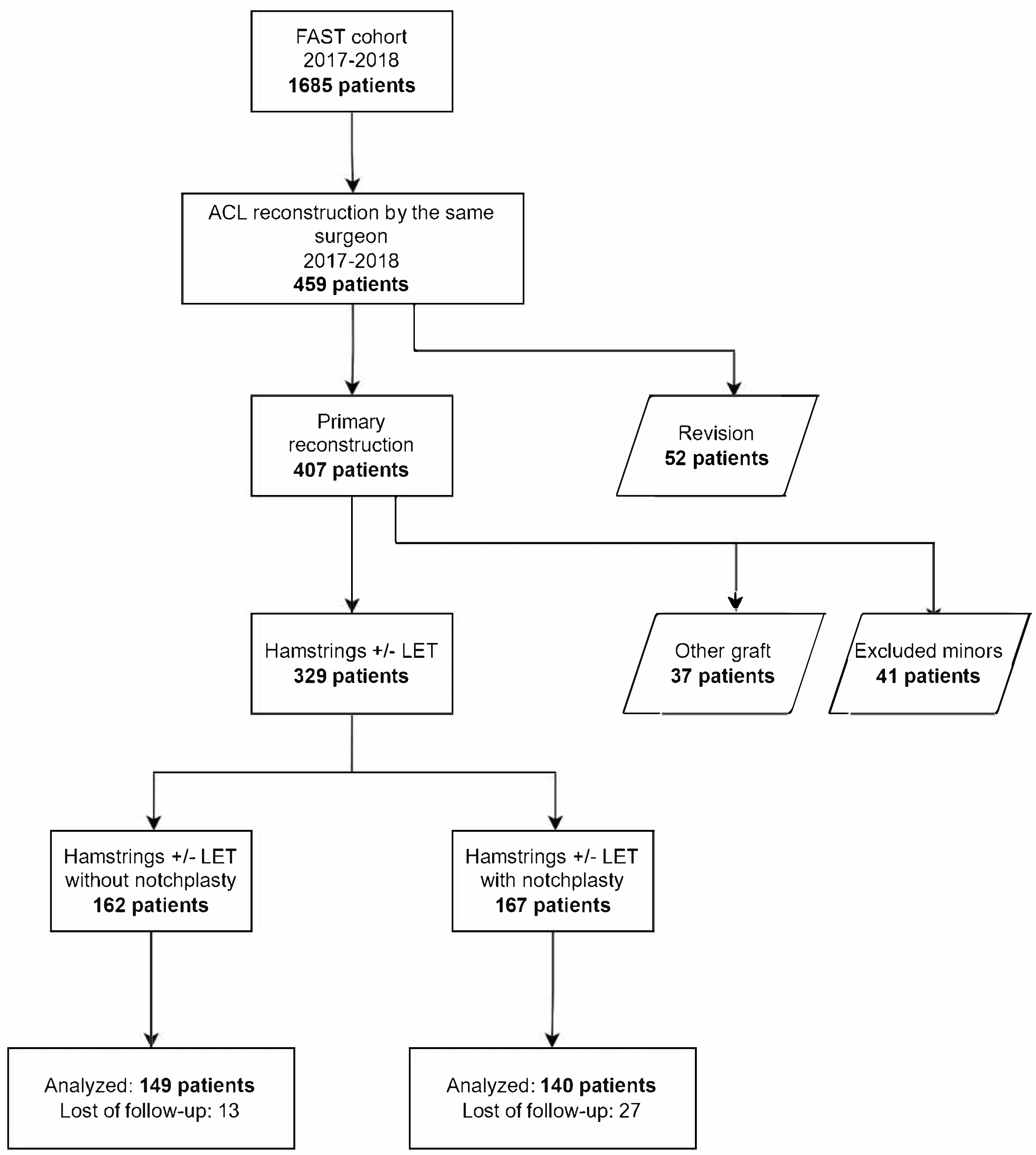 Between 2017 and 2018, 1685 patients were in the cohort; 459 underwent ACL reconstruction by the same surgeon. After excluding 52 revisions, 41 minors, and 37 with other grafts, 329 remained. Notchplasty was performed in 167 patients in 2018 (Figure 1).