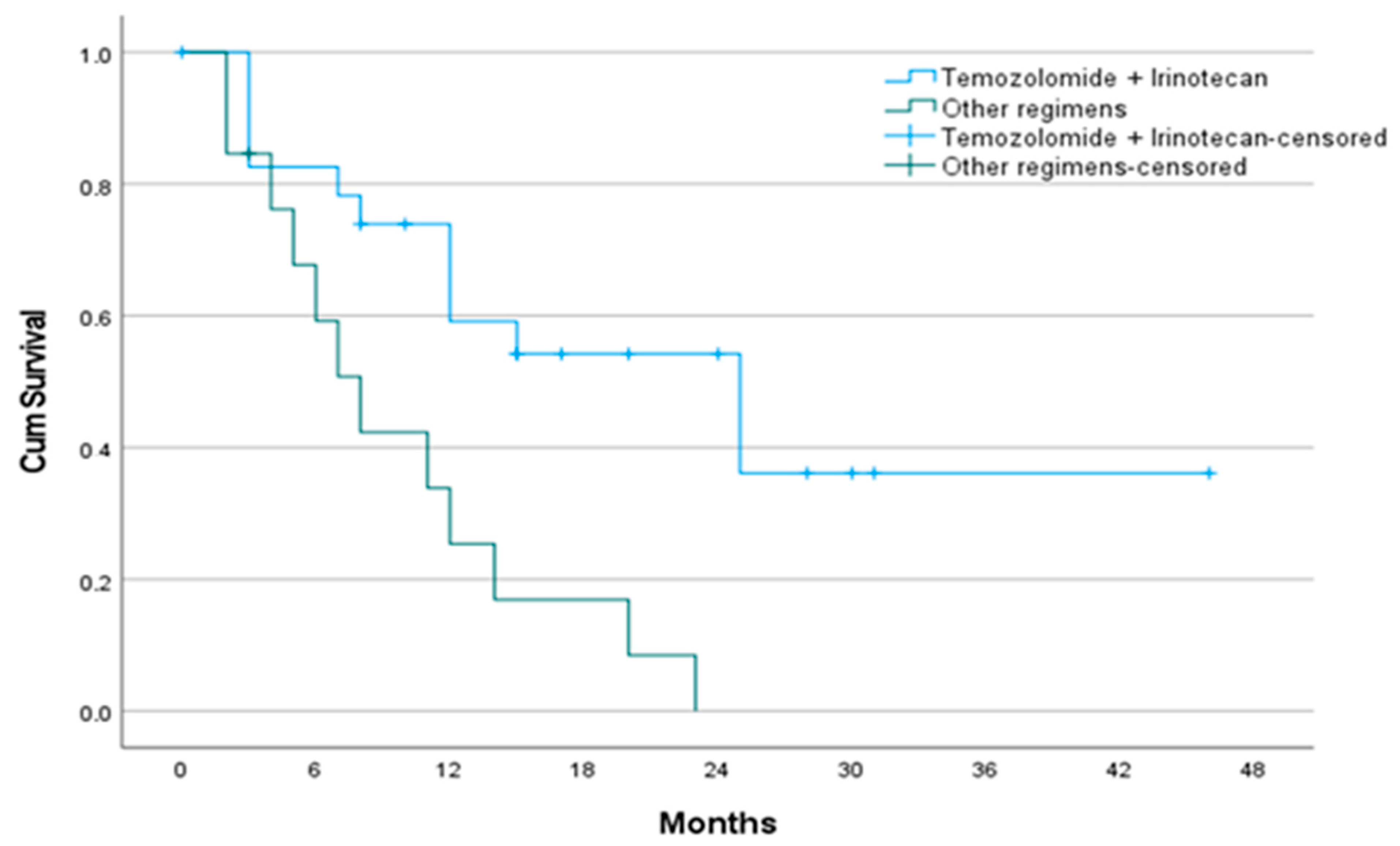 Other regimens (vs. TMZ+IRI) | 3.495 | 1.489–8.203 | 0.004 | 2.820 | 1.030–7.722 | 0.044 |
