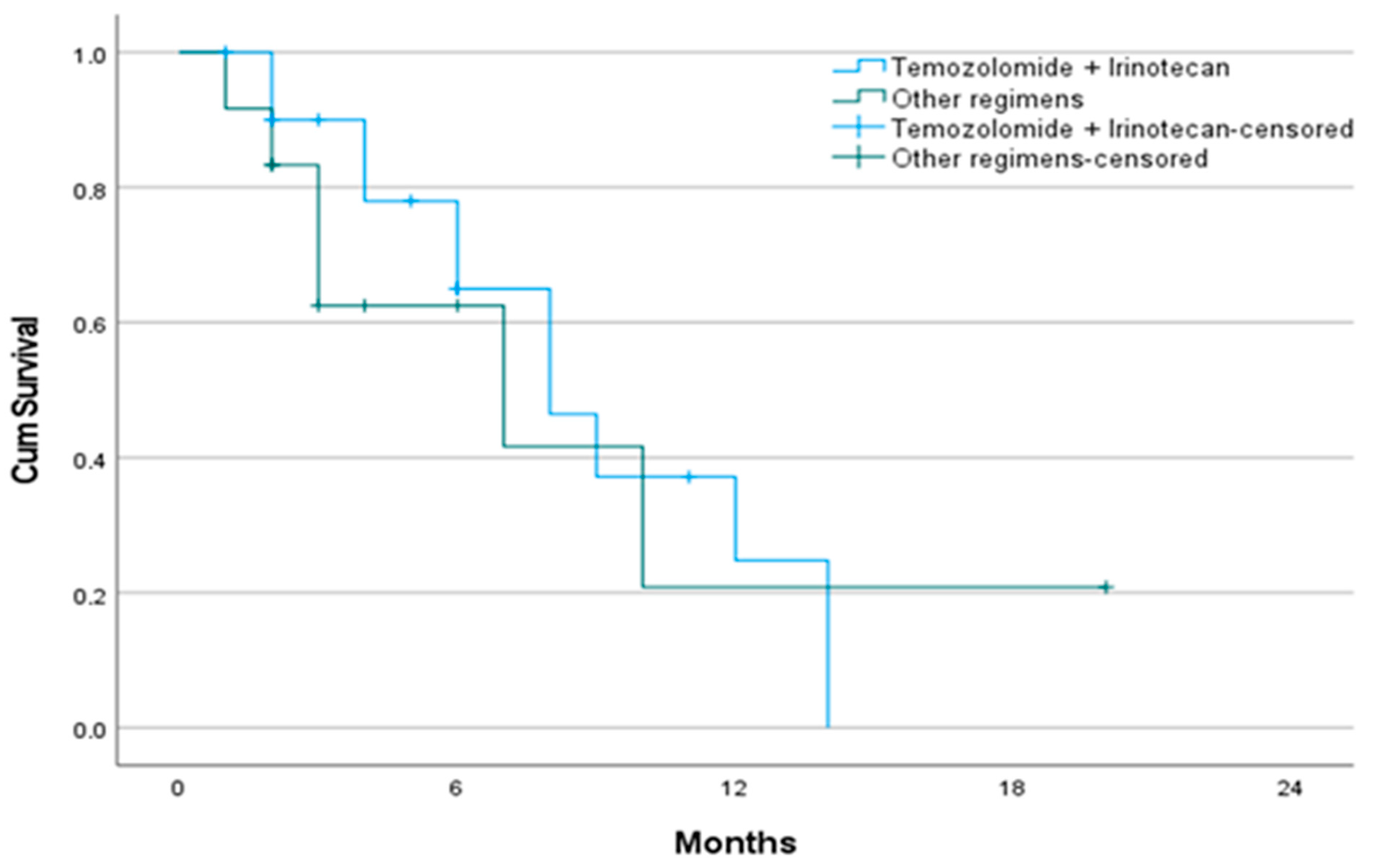 p = 0.733 | Temozolomide + Irinotecan | 8 | 1.5 | 5.1 | 10.9 |