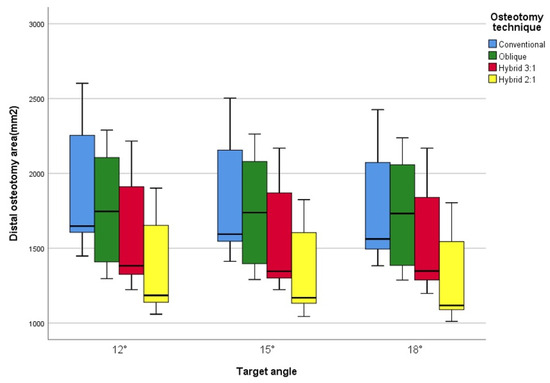 Figure 2. Distal osteotomy surface area values categorized by technique and target angles.