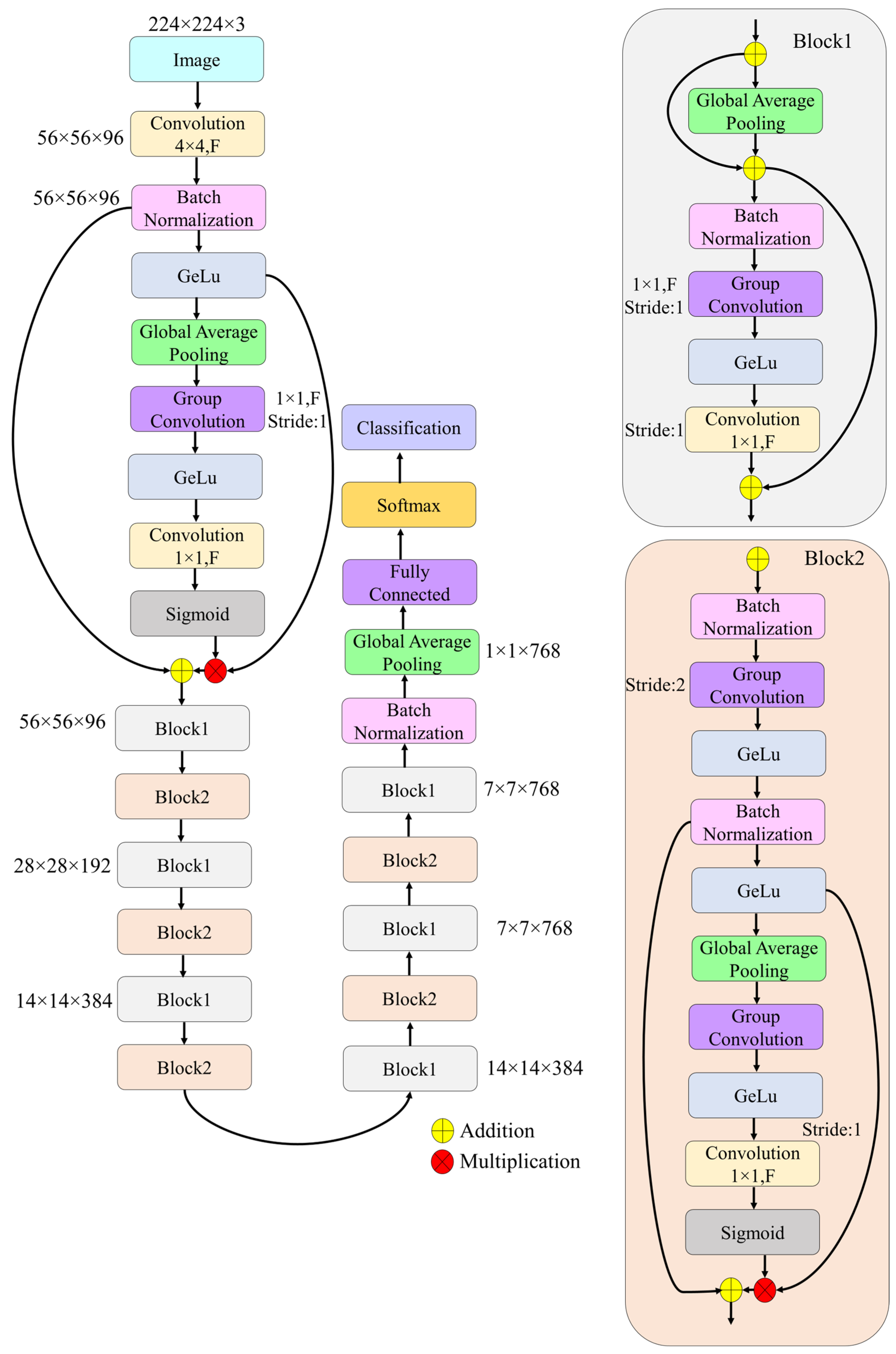 Block2 (stride ): This block performed downsampling while simultaneously increasing channel depth. Its operations included grouped convolution with stride 2, batch normalization, GELU activations, global average pooling, channel attention, and a final pointwise convolution followed by sigmoid activation. The residual connection incorporated attention-weighted features, completing an inverted bottleneck block with adaptive feature scaling.