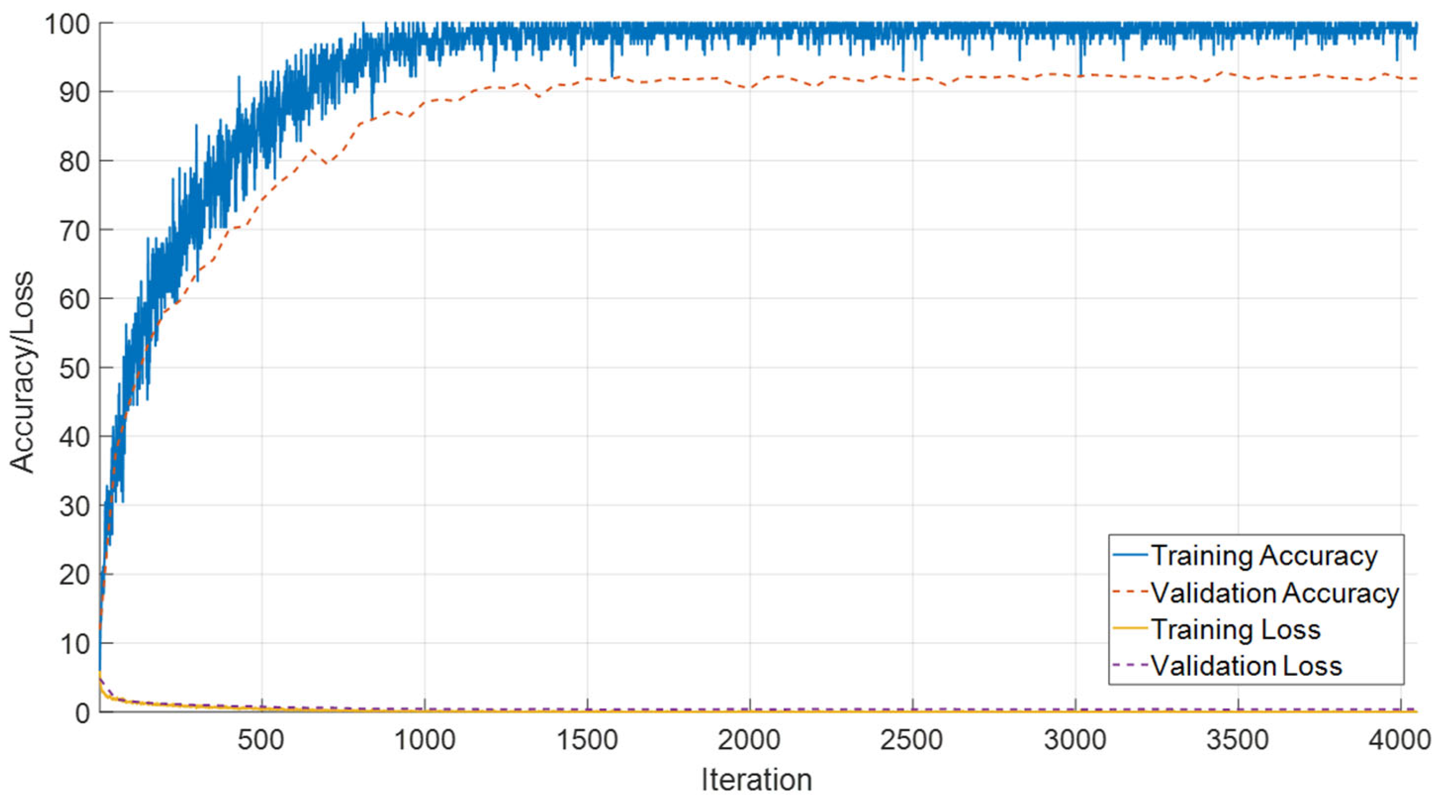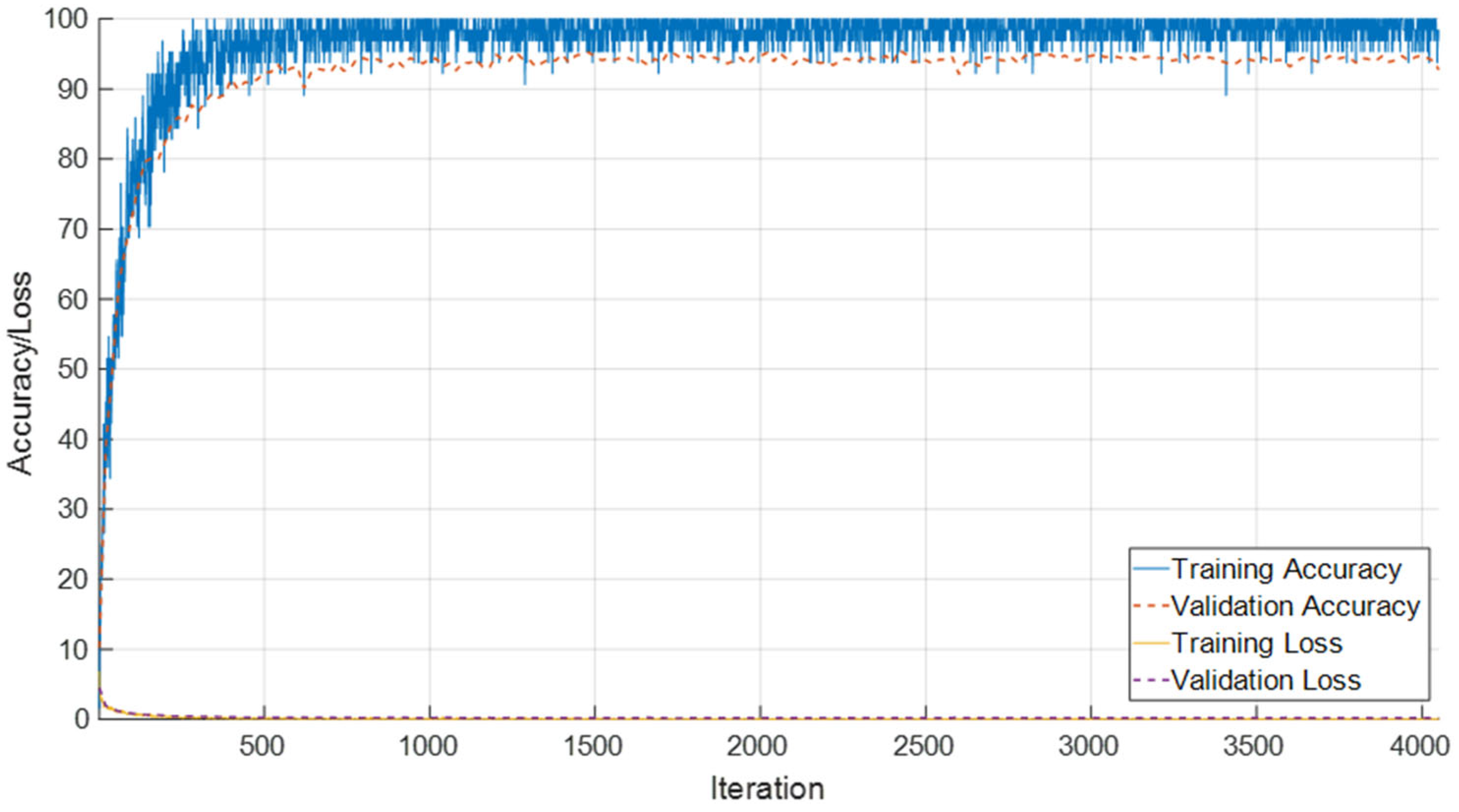 Step 7: The network was trained end-to-end using categorical cross-entropy loss. Optimization was performed with the RMSProp solver, initialized at a learning rate of , squared gradient decay factor of 0.9, and . Training was conducted for 50 epochs with a mini-batch size of 128. L2 regularization () was applied to mitigate overfitting, and batch normalization used population statistics. Data were shuffled at each epoch, and validation was performed every 20 iterations.