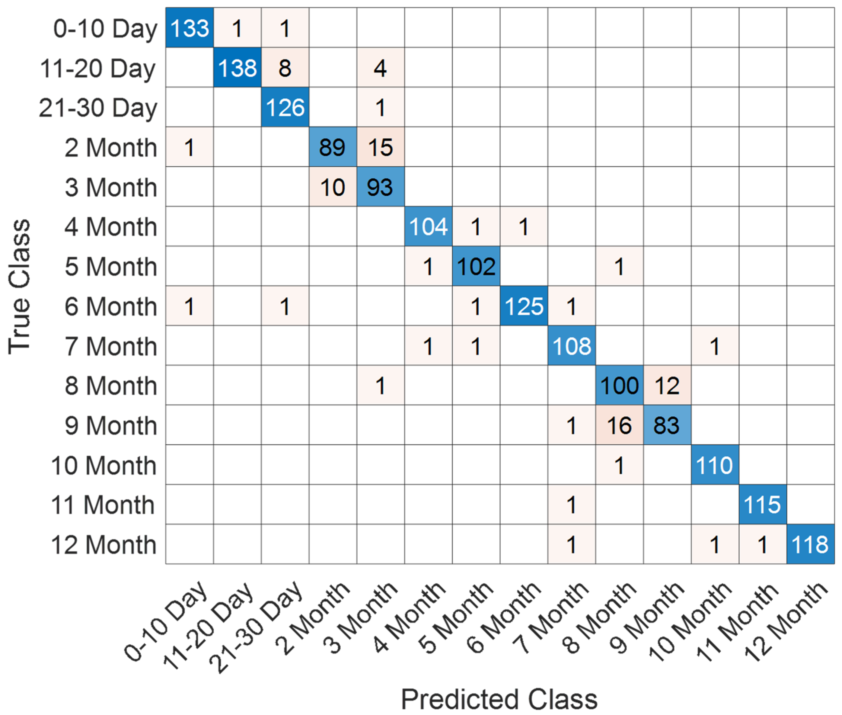 Figure 13, where the confusion matrix highlights the distribution of true and misclassified samples across all developmental intervals. The majority of predictions are concentrated along the diagonal axis, reflecting the strong discriminative power of the model. Only a limited number of off-diagonal elements are observed, primarily in adjacent temporal categories, which suggests that potential misclassifications occurred in biologically neighboring developmental stages rather than distant ones.