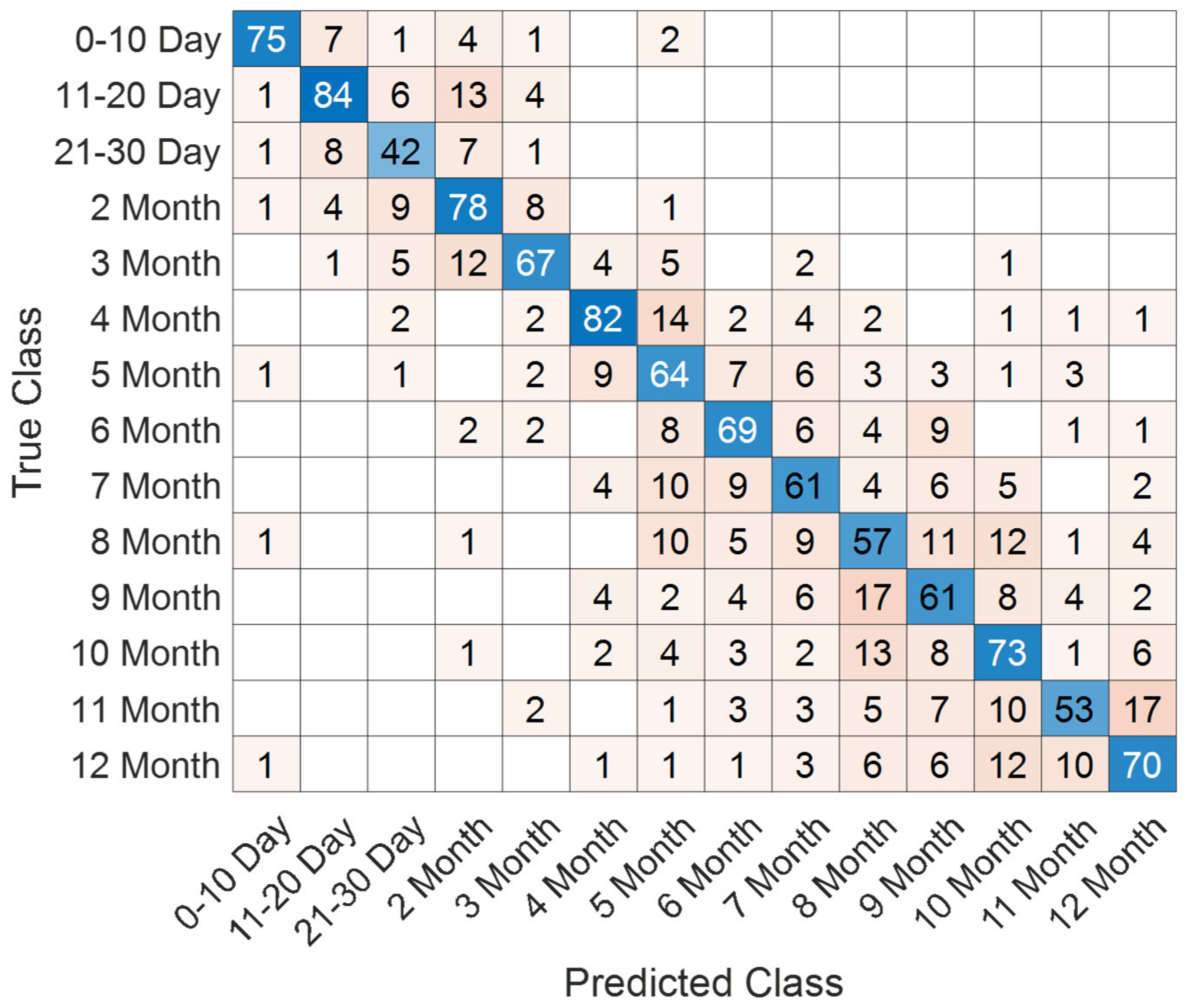 Figure 7 demonstrates that most samples were accurately classified, with only minor misclassifications observed across adjacent monthly categories. For instance, occasional errors occurred between the 3rd and 5th months as well as between the 11th and 12th months. This reflects the gradual and overlapping nature of neonatal brain maturation, particularly in closely neighboring time intervals.