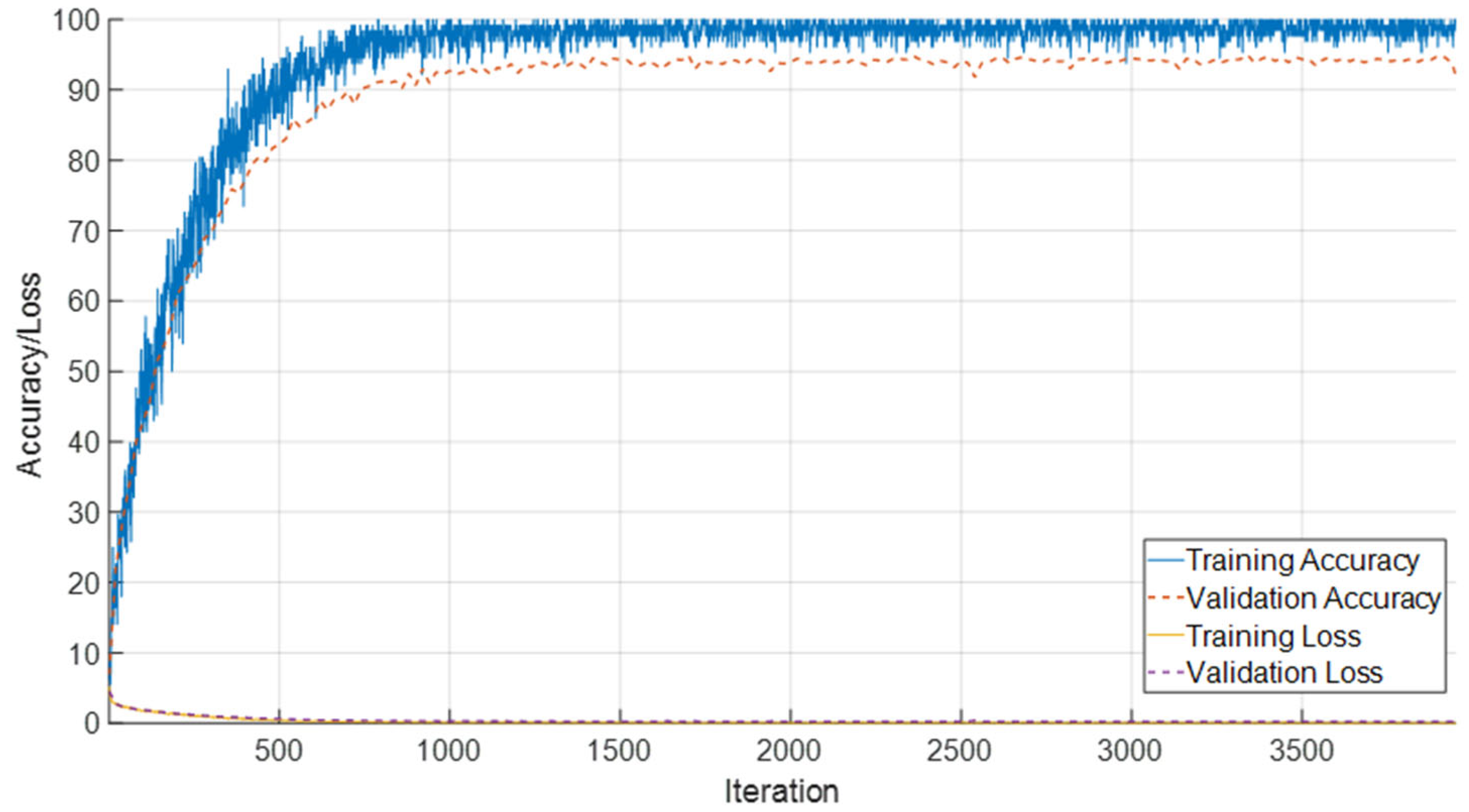 Figure 6, the training and validation accuracy curves rapidly increased during the initial iterations, reaching stable convergence above 95% after approximately 600 iterations. In parallel, both training and validation loss values decreased steadily and remained close to zero, indicating efficient optimization and the absence of overfitting.