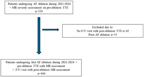 This is a retrospective single-center cohort of patients with documented symptomatic AF who were referred for their first AF catheter ablation (index ablation) during the years 2014–2023 in The Jesselson Integrated Heart Center, Shaare Zedek Medical Center (SZMC), Jerusalem. Patients were included if they had undergone baseline trans-thoracic echocardiogram (TTE) within 3 months before the procedure and had a cardiology clinic follow-up visits (≥2) as well as post-ablation TTE within 3 months to 3 years post-ablation. Patients with prior ablations, prior cardiac surgery, or absence of cardiac follow-up visits after their index AF ablation were excluded. The study received approval from the IRB committee of SZMC. Notably, patients with baseline severe MR referred for AF ablation were mostly declined mitral valve surgery due to high surgical risk or patient preference.
