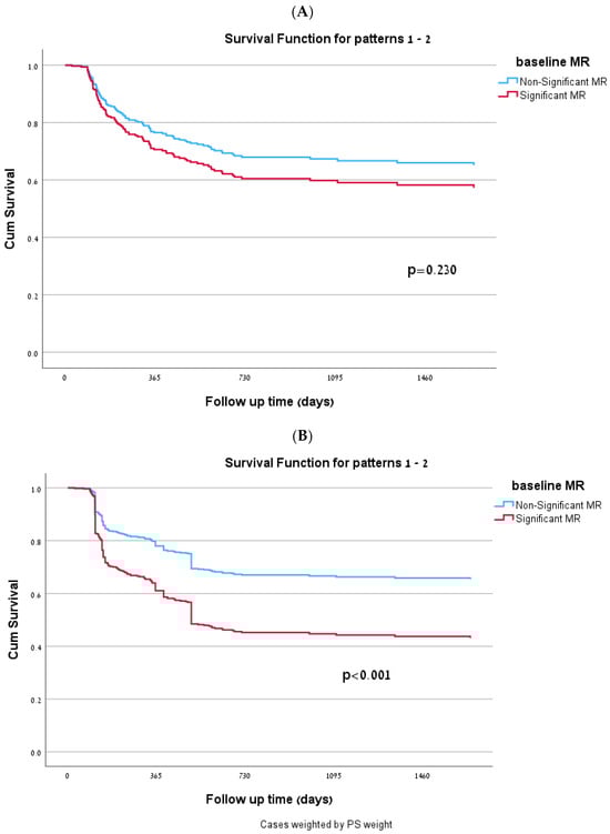 In our historical cohort study, due to the relatively rare occurrence of the main exposure variable, namely ‘significant’ baseline MR, we faced difficulty in standard analyses, which may yield biased estimates due to poor covariate balance between the exposed and unexposed subgroups and low statistical power. Thus, we employed the inverse propensity score weighting (IPTW) method, which can help mitigate these issues by reweighting the sample to create a pseudo-population in which the distribution of baseline covariates is balanced and independent of the exposure status [18,19].