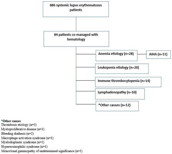Patients were identified through the hospital database using the ICD-10 code M32 for SLE. To minimize misclassification and reduce false positives, all cases underwent detailed chart review to confirm clinical features and fulfillment of the 2012 SLICC [11] and/or 2019 EULAR/American College of Rheumatology (ACR) classification criteria [12]. This retrospective cohort included patients aged ≥18 years who met these criteria and were referred to the hematology department during follow-up. Among 886 patients identified with the ICD diagnosis code M32, the demographic, clinical, and laboratory characteristics of 84 patients referred to hematology were analyzed (Figure 1). The clinical spectrum within this cohort included hematologic abnormalities such as thrombocytopenia, hemolytic anemia, leukopenia, and hypocomplementemia. Other manifestations involved serositis and mucocutaneous, musculoskeletal, renal, neuropsychiatric, cardiovascular, and pulmonary system involvement.
