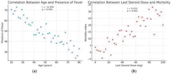 Scatter plot illustrating the correlation between (a) age and the presence of fever, and (b) the last steroid dose and mortality among patients with systemic lupus erythematosus.