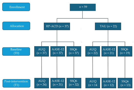Flowchart of the pilot study. RP-ACD = Relapse Prevention for patients with Alcohol-related Cognitive Disorders (RP-ACD); TAU = treatment as usual; AUQ = Alcohol Urge Questionnaire; AASE-12 = Alcohol Abstinence Self-Efficacy Measure; SSQ6 = Social Support Questionnaire—Short Form.