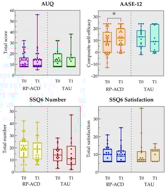 Box and whisker plots showing the results for the pre-intervention (T0) and post-intervention (T1) timepoints on the Alcohol Urge Questionnaire (AUQ total item score), the Alcohol Abstinence Self-Efficacy Measure (AASE-12 composite self-efficacy score) and the Social Support Questionnaire (SSQ6 total number of people and total satisfaction score) for the Relapse Prevention for patients with Alcohol-related Cognitive Disorders (RP-ACD) group and the treatment as usual (TAU) group. The boxes indicate the 25th and 75th percentile, the center line represents the median and the whiskers the minimum and maximum values. * p = 0.014 (two-tailed).