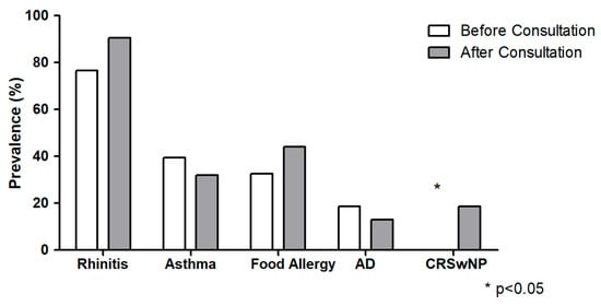 - Benninger, M.S.; Strohl, M.; Holy, C.E.; Hanick, A.L.; Bryson, P.C. Prevalence of atopic disease in patients with eosinophilic esophagitis. Int. Forum Allergy Rhinol. 2017, 7, 757–762. [Google Scholar] [CrossRef]